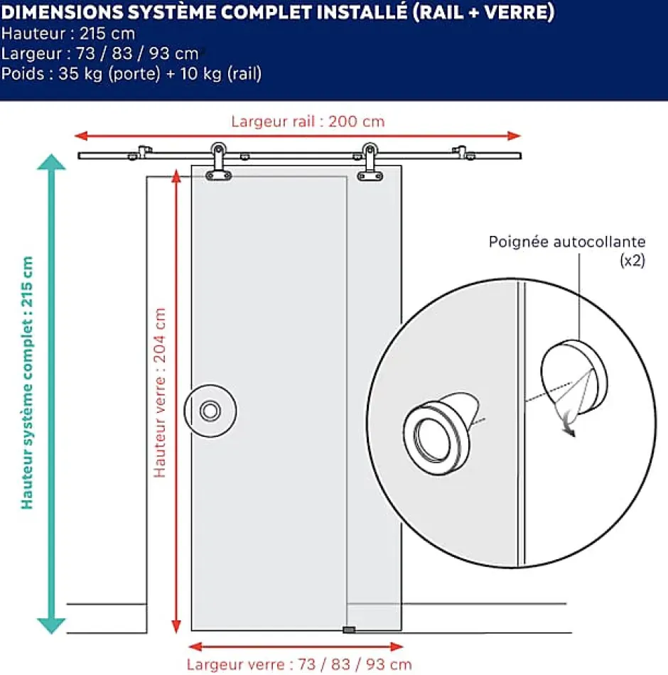 - Kit complet : rail 2 m recoupable, guide au sol, 2 poignées à coller, vis et chevilles