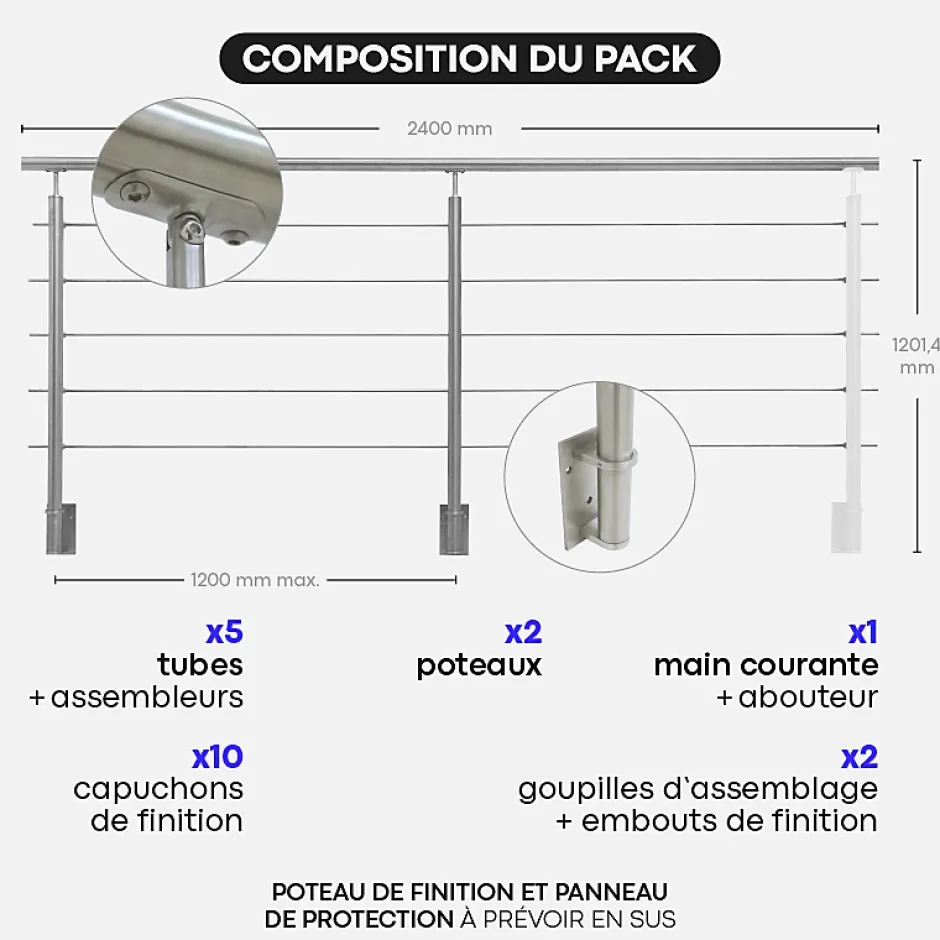 - Ce kit vous permet d’installer vous-même 2,4m linéaires, sur une surface plane, en vous économisant les frais d’un poseur professionnel !1 kit contient 1 main courante 240cm, 5 tubes 240cm, et 2 poteaux