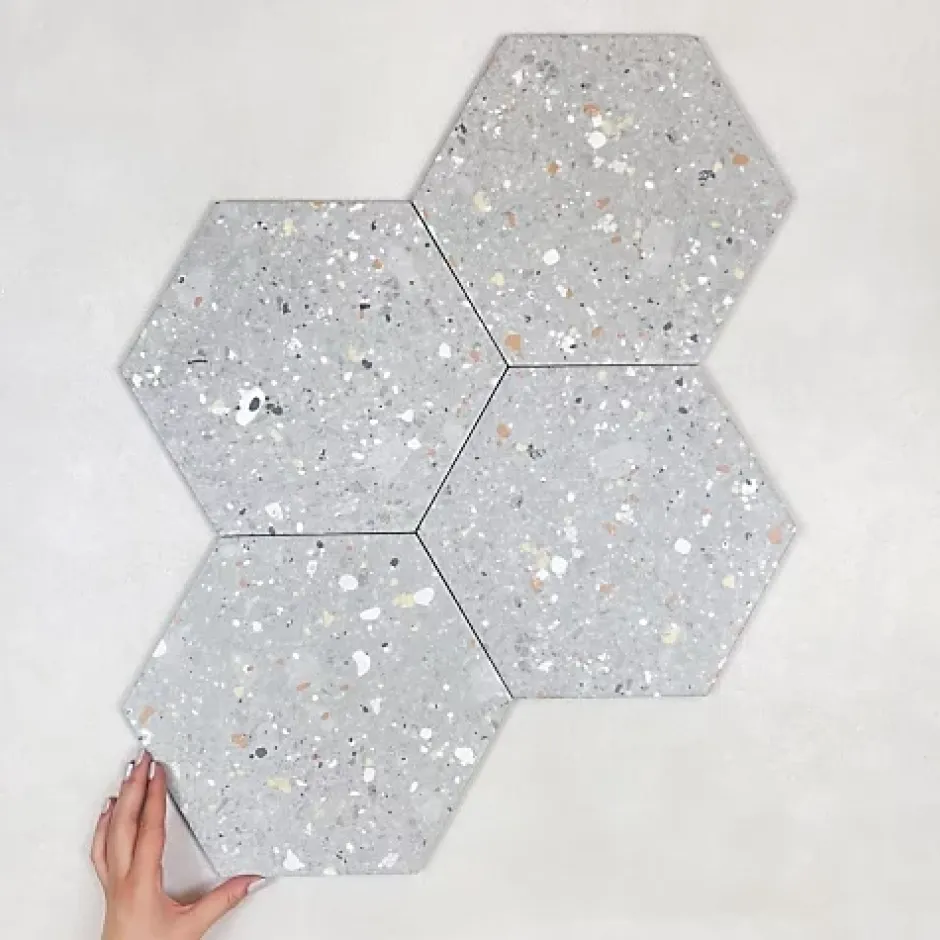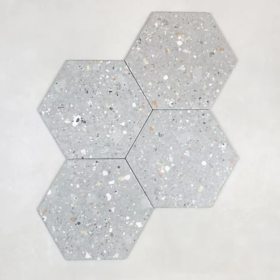 Les Carreaux De Jean  Carrelage Effet Terrazzo Hexagonal AROUSA 25,8×29 Gris – Les Carreaux de Jean