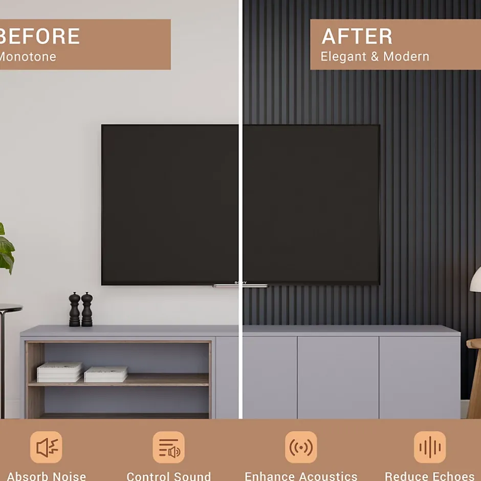 Alliant performance acoustique et esthétique contemporaine, nos panneaux acoustiques souples constituent une solution idéale pour améliorer le confort sonore de vos espaces tout en apportant une finition décorative soignée.Caractéristiques techniques :Dimensions : 240 cm x 60 cmÉpaisseur : 1,1 cmSurface couverte : 1,44 m² par panneauPoids : 5 kgMatériaux : feutrine + lattes MDF plaquéesFixation : colle silicone ou visUtilisation : isolation et traitement acoustiqueCompatibilité : tous types de pièces (habitation, bureau, usage professionnel)Structure et matériauxLes panneaux se composent de deux couches principales :Une base en feutrine acoustique permettant une absorption efficace des sons et une réduction des nuisances sonores.Une finition en lattes de MDF (fibre de bois à densité moyenne), recouvertes d’un placage esthétique et résistant, offrant un rendu élégant et durable.Amélioration acoustiqueGrâce à leur structure multicouche, ces panneaux réduisent efficacement les résonances et réverbérations. Ils sont adaptés à de nombreux environnements : bureaux, studios, open-spaces, salons, salles de réunion ou home cinéma.Installation simple et rapideLeur conception légère (5 kg) permet une pose facile sur murs ou plafonds à l’aide de colle silicone ou de vis. Aucun encadrement spécifique n’est nécessaire.Découpe conseillée : pour ajuster les panneaux aux dimensions souhaitées, l’utilisation d’une scie circulaire est recommandée afin d’obtenir une coupe nette et précise.EntretienDépoussiérage à l’aide d’un balai ou d’un aspirateur avec embout douxEn cas de taches : chiffon propre, humide et bien essoréÉviter les produits abrasifs