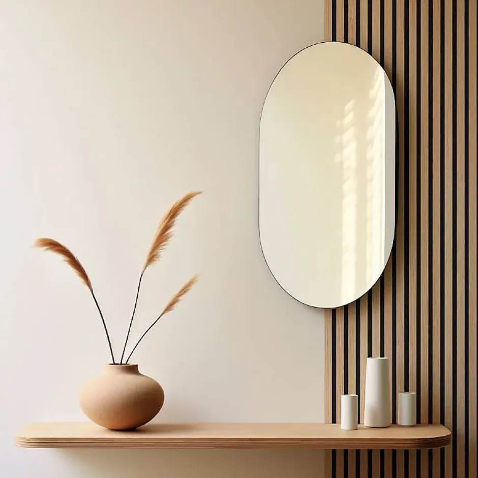 Le mur en tasseau de bois est l’une des dernières tendances dans le monde de la décoration d’intérieur. De plus en plus apprécié par les amateurs de home staging ou les architectes, ils sont désormais accessibles pour tous les amateurs de déco afin de créer un mur TV, une entrée moderne et chic, une tête de lit cocooning ou simplement pour donner une ambiance scandinave design dans votre intérieur. Nous vous proposons ce lot de 2 panneaux afin de moderniser rapidement une entrée, un pan de mur ou de créer une tête de lit en position horizontale.Decoon vous propose une solution tout-en-un, prête à poser avec ce pack produit ultra pratique ! Cette solution de 250 x 30cm d’une épaisseur de 2cm est la solution idéale pour moderniser rapidement et facilement votre intérieur. En un rien de temps, vous apporterez du cachet à votre intérieur tout en créant un décor en tasseaux cosy et chaleureux. Ce pack est composé de 2 panneaux muraux, créant ainsi une surface de 1,5m2 de 60 cm de long sur 250 cm de haut. Derrière son côté minimaliste et épuré, c’est bien plus qu’un simple panneau tasseaux bois : son épaisseur de 2 cm vous offre un confort acoustique amélioré grâce aux propriétés absorbantes de la feutrine.Présentation du panneau tasseau boisCe panneau est composé d’une feutrine noire et de lattes de bois espacées. Il présente une épaisseur totale de 2 cm : 8 mm d’épaisseur de feutrine et 11 mm d’épaisseur de tasseau. Chaque tasseau présente une largeur de 27 mm avec un espacement de 16 mm avec le suivant. Le panneau de tasseaux bois est de dimensions 250 x 30 cm.Chaque tasseau est composé d’une base en MDF revêtu d’un véritable placage en chêne clair. Il présente une section de 27 x 6 mm.Avantages du mur tasseau boisLe
