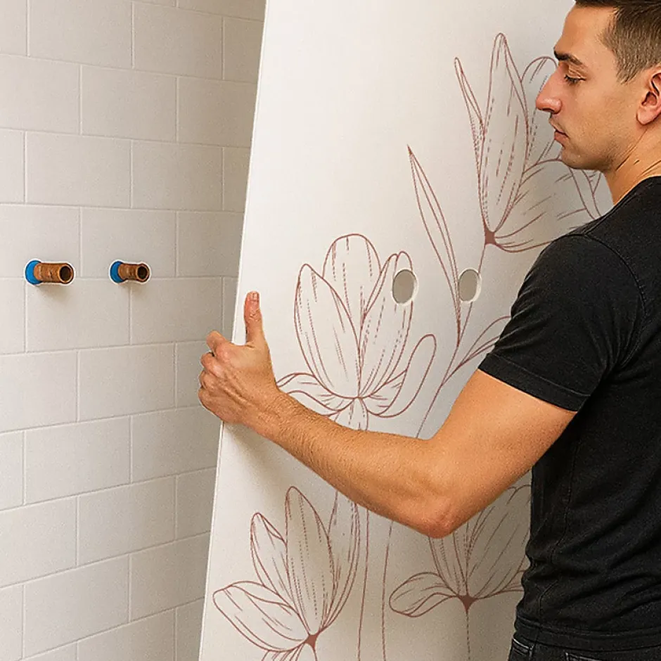 Panneaux muraux de douche en aluminium composite de 3 mm et profilés – Faciles à poser et à nettoyer (Fabrication française) Protégez et modernisez votre salle de bain avec ce pack de panneaux muraux, résistants, élégants et prêts à poser. Alternative contemporaine à la faïence murale, ces panneaux en aluminium de 3 mm offrent une solution rapide, pratique et durable pour habiller vos murs de douche. Leur finition apporte un rendu premium tout en facilitant l’entretien au quotidien. Points forts : Pack complet : 2 panneaux (90×220 cm et 120×220 cm) + 3 profilés (2 profilés de finition et 1 profilé d’angle). Pose rapide : installation rapide pour un résultat propre et durable. Découpe facile : une découpe à la scie cloche est conseillée pour l’installation de la robinetterie. Raccordables : panneaux raccordables à droite ou à gauche selon la configuration de votre douche. Supports compatibles : Placo, carrelage existant, faience, toile de verre, bois, béton. Conception française : Dessiné dans notre studio graphique et fabriqué dans notre atelier à Agen (47 – France) Caractéristiques : Couleur des panneaux : blanc et terracotta Couleur des profilés : blanc Dimensions des panneaux : 90×220 cm et 120×220 cm Matériau : Aluminium composite Épaisseur : 3 mm Entretien : compatible raclette silicone, micro-fibre, éponge douce et eau chaude (pas de produits abrasif) -> si besoin ajouter du vinaigre blanc. Étanchéité : Joints silicone : appliquez un joint silicone entre les panneaux, le receveur et les profilés. Une solution élégante, durable et simple à installer pour transformer votre espace douche.