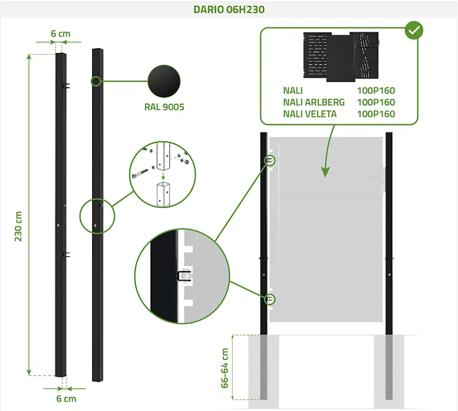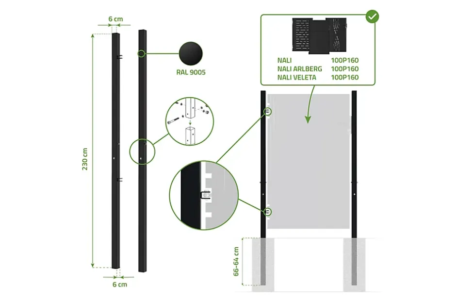 Lot de 2 poteaux en fer – Noir MatHauteur : 230cm & Section: 6x6cm Poteaux très résistants en acier galvanisé A sceller ou visser sur platineCasanoov est spécialisé dans les portails et portillons en KIT, à assembler et à poser soi-mêmeLes poteaux en acier DARIO ont été conçus pour permettre la pose des portails et portillons modèles NALI.Traités anti-corrosion, ce lot de deux poteaux en acier galvanisé s’avère très résistant, quelles que soient les conditions climatiques.Ce pack composé de deux poteaux DARIO de diamètre 60mm et de hauteur 230cm est parfaitement adapté aux portillons CASANOOV suivants : – NALI 100P160 NOIR- NALI ART ARLBERG 100P160 NOIR- NALI ART VELETA 100P160 NOIRColoris : Noir mat (RAL : 9005)Matériau : Acier galvaniséHauteur du poteau : 230 cmSection du poteau : Ø60 mmMode de pose : à sceller ou visser sur platineHauteur maximum du portillon à installer : 160 cm (Modèle NALI)Conseils :Afin de permettre le scellement de nos portails et portillons en acier, les poteaux ont été conçus 50 cm plus longs que la hauteur du portail ou portillon correspondant.Pour une installation sécurisée et solide, il est recommandé de sceller vos poteaux entre 44 et 46 cm de profondeur.Si vous ne désirez pas les sceller, il est tout à fait possible de les poser sur des platines pour portillon.Dans ce cas, nous vous conseillons de scier les poteaux pour des raisons esthétiques.Conçus en coloris noir mat (RAL : 9005), ils seront parfaitement assortis à votre portail et/ou portillon NALI pour un extérieur uniforme et surtout élégant.