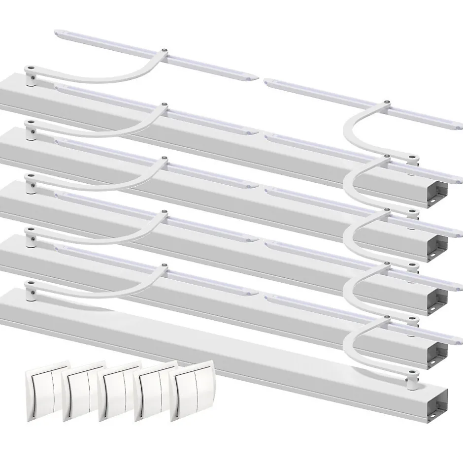 Lot de 5 motorisations en linteau pour volets battants Commande filaire avec interrupteur Baie de 800 à 1500 mm (2 vantaux) Carter blanc et bras blanc Fabriqué en France Garantie : 2 ans Quantité : 5 Attention : Volet non compris dans le kit. Lot de 5 motorisations pour volets battants WINEO filaire – baie de 800-1500 mm – carter blanc – bras blanc pour 5 paires de volets battants.En neuf ou rénovation, WINEO vous permet de conserver vos volets existants et s’adapte sur tous types de volets battants simple ou double vantaux.Pour plus de détails, consultez la notice de pose. Spécifications à respecter : – Largeur du vantail : 40 cm min / 80 cm max- Surface max du vantail : 1,6 m²- Poids max du vantail : 50 kg- Largeur tableau : 15 cm- Distance max axe du gond / bord de la baie : cote A (voir abaque des bras)- Distance max mur / volet extérieur : cote B (voir abaque des bras)- Distance min haut du volet / haut de l’écharpe : 90 mm- Pour C ≥ 150 mm : utiliser les bras W1 (livrés dans le kit)- Pour C ≥ 100 mm : utiliser les bras W2 ou W3 (disponibles en pièces détachées ) Description : – Kit complet prêt à la pose pour équiper 5 paires de volets battants.- Recoupable : mise en place rapide et facile.- Discret : carter extra-plat de 50 mm de hauteur, en aluminium.- Performant : 1 bloc moteur par vantail.- Résistant : bras et pignon de sortie en acier haute résistance.- Sécurité : détection d’obstacle.- Pilotage possible par une domotique (nous consulter).- Produit sans entretien.- Installation Plug and Play (programme d’apprentissage).- Conforme à la norme NF P26-341. – Produit conçu et fabriqué dans nos ateliers en France, testé unita