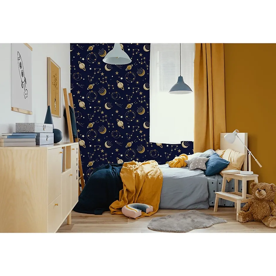 Laissez-vous emporter dans un voyage interstellaire avec le papier peint « Astre » de la collection Les Aventures par Lutèce. Imaginez-vous flottant dans l’immensité de l’espace, entouré de myriades d’étoiles scintillantes. Autour de vous, les planètes gravitent en silence, tandis qu’une douce brise cosmique effleure votre visage. C’est cette sensation de légèreté et de magie que ce papier peint invite à ressentir chaque jour. Son motif céleste transporte les enfants dans un univers sans limites. Saturne et ses anneaux, des lunes mystérieuses, des étoiles filantes : tous dansent au cœur d’une galaxie lumineuse. Les nuances profondes de bleu marine associées aux reflets dorés créent une atmosphère douce et captivante, idéale pour éveiller l’imaginaire des petits explorateurs. Fermez les yeux un instant… et visualisez votre enfant s’endormant paisiblement sous un ciel étoilé, bercé par des rêves d’aventures spatiales. Ce décor féerique nourrira sa curiosité et l’invitera à découvrir les merveilles de l’univers. Côté pratique, sa composition en papier intissé rend l’entretien simple et rapide. Facile à poser, ce revêtement mural se colle directement sur le mur — plus besoin de table à tapisser ! Il suffit de découper une première bande, d’encoller le mur, puis d’appliquer la lé. Vérifiez simplement les raccords avant de passer à la suivante. Et en cas de petit raté ? Pas de panique : les bandes sont repositionnables, pour une pose sans stress et un résultat impeccable.