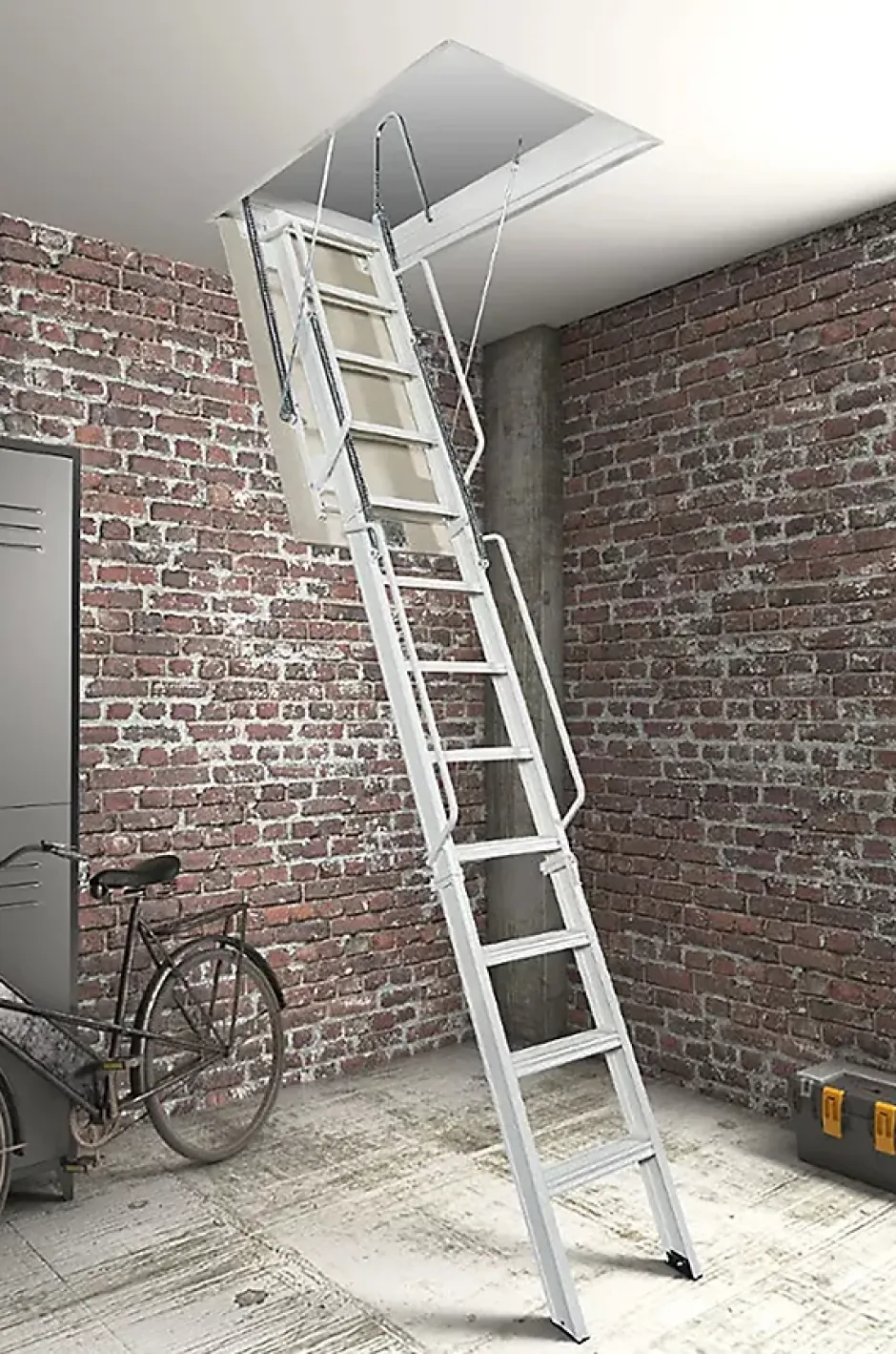 ACCES COMBLE- Adapter pour les maisons individuelles, garages, ateliers pour accéder aux greniers ou aux combles.- Aménagement des combles et greniers lors de travaux de construction ou rénovation.- Agrandir une surface habitable en accèdant à un espace non aménagé ou pour un accès terrasse.- Parties communes d’un immeuble, cage d’escalier, pour accéder aux espaces sous les toits.- En milieu industriel pour un un accès au toit d’un bâtiment.GROßE DECKENÖFFNUNG- Leiter mit 1.90m Deckenöffnungslänge- Ermöglicht den Durchgang mit sperrigen Möbeln: Sofa, Bett, Schrank…- Ermöglicht die Einrichtung eines Raumes im Dachgeschoss oder die Lagerung in einem DachbodenSECURITE- 2 poignées supérieures d’arrivée.- 4 mains-courantes latérales pour une utilisation sécurisée et confortable.- Fourni avec 1 perche pour une ouverture et fermeture facilité et sans risques de l’échelle.ISOLATION- Trappe en bois de peuplier d’une épaisseur de 16 mm avec un loqueteau de sécurité en fer.- Garantir une bonne isolation entre les combles ou le grenier et le reste de l’habitation. HAUTEUR AJUSTABLE- Echelle livrée de série pour une hauteur de 4.66, 4.76 ou 4.85m.- Possibilité de réduire la longueur de l’échelle de 10cm.- Dévisser les 4 vis en parties hautes de l’échelle pour effectuer le réglage (Cf image montage).- Autres hauteurs possibles sur demande. MONTAGE FACILE- Le montage de cette échelle escamotable se fait en seulement 5 étapes.- Présenter l’échelle en dessous de la trémie pour la hisser jusqu’à l’intérieur de la trémie.- Introduire les étriers de fixation et visser les écrous.- Quelques ajustement peuvent être fait suivant l’encastrement de l’échelle dans la trémie.- Ne pas visser les écrous en totalité dès la première pose. – Une fois l’échelle escamotable correctement encastrée il