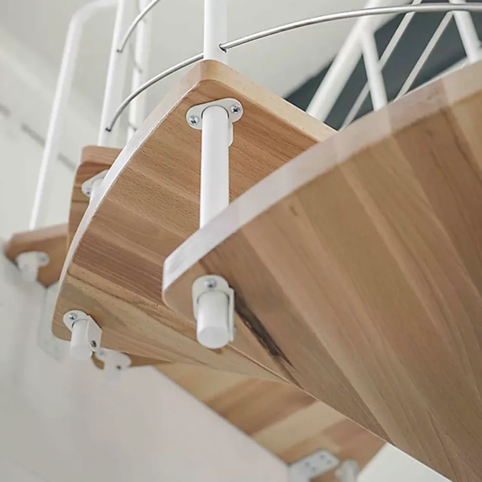 ESCALIER DESIGN- Le bois de hêtre est idéal pour créer une décoration simple et épurée dans une ambiance zen.- La forme des marches a été pensée pour un confort et une sécurité optimale tout en réduisant au minimum l’encombrement de l’escalier.- L’escalier hélicoïdal offre un accès sécurisé et confortable à un étage dans une maison individuelle.- Lors de l’aménagement ou la rénovation d’une habitation l’escalier hélicoïdal saura s’adapter quel que soit votre intérieur et la hauteur à franchir.STRUCTURE- Structure en acier avec une peinture mate et anti-rayures, coloris blanc.- Traitement avec une poudre époxy qui ne dégage pas de solvants toxiques.- Possibilité de régler la hauteur de l’escalier en faisant varier le nombre d’entretoise sur la structure au moment du montage.MARCHES- La conception des marches offre une grande résistance mécanique et une stabilité élevée pour un escalier avec une grande durée de vie.- Marches en hêtre massif verni traité anti-UV d’une épaisseur de 35 mm.- Hauteur des marches réglable individuellement de 19 à 23,5 cm- Nombre de marches palier inclus.RAMPE ET MAIN-COURANTE- La rampe et la main-courante garantissent un accès sécurisé lors de la montée et de la descente.- Main courante en PVC diamètre 22 mm- Sens du montage de la rampe modulable à droite ou à gauche (sens horaire ou anti-horaire)TREMIE- Trémie minimum conseillée : 110 x 110 cmCHARGE ADMISSIBLE- Charge admissible par marche : 200kg- Charge admissible total : 800kgMONTAGE- 2 personnes minimums conseillées.- Débuter la pose de l’escalier par la dernière marche (marche la plus haute) après avoir lu les instructions en entière.- L’escalier est boulonné au sol et en hauteur au niveau du plancher- Visserie fournie pour une dalle en béton.- Compter 1 jour de montage pour une pose