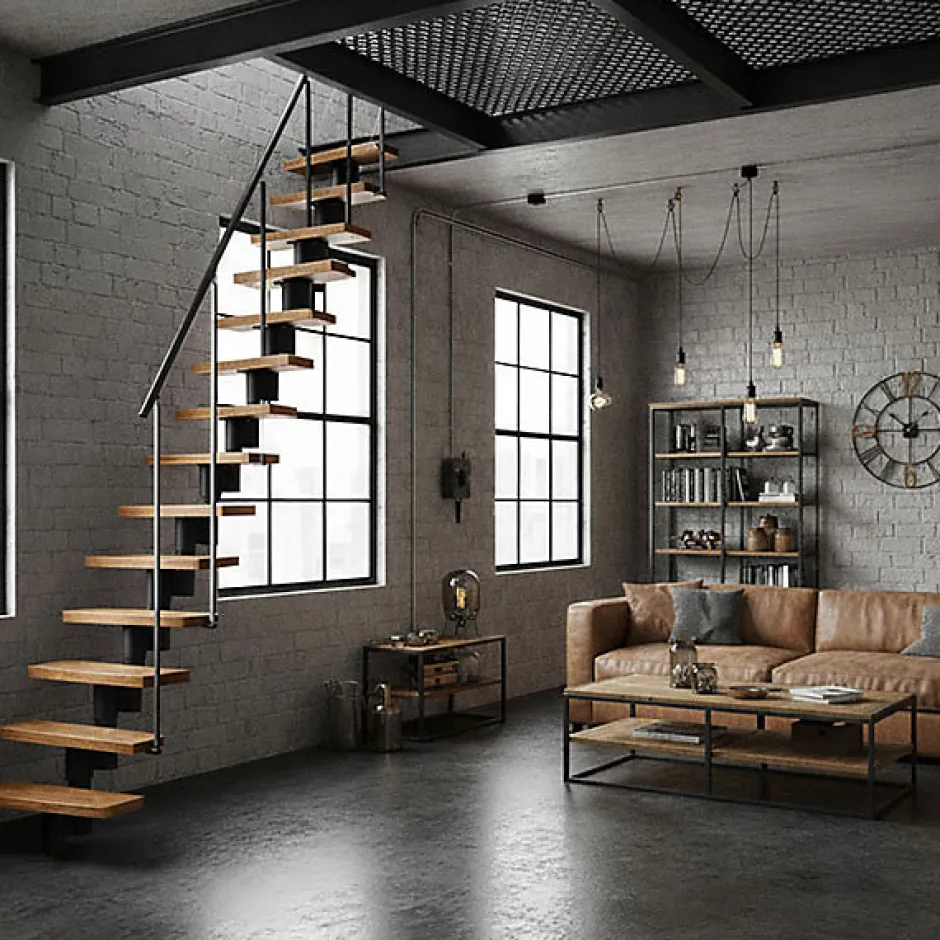 ESCALIER DESIGN- L’escalier d’intérieur droit en bois et acier est une solution simple et design pour accéder à un étage ou une mezzanine- Le mélange du bois massif et de l’acier offre des contemporaine à votre intérieur.- Peut s’intégrer dans un duplex au style Loft ou dans une maison moderne.- Sa conception droite permet d’optimiser l’espace en réalisant un espace de rangement ou de décoration sous l’escalierESPACES REDUITS- Escalier d’intérieur d’une largeur de 0.60 mètres pour des habitations avec des espaces réduits.- Passer d’un étage à un autre ou un espace en hauteur comme dans des appartements parisiens qui ont une surface réduite.HAUTEUR REGLABLE- Régler la hauteur en faisant varier la hauteur de la fixation sur la structure au moment du montage.- Pour une configuration spécifique, n’hésitez pas à nous adresser vos côtes (hauteur sous plafond et épaisseur de dalle) et photos de l’emplacement de l’escalier.STRUCTURE ET RAMPE NOIRE- Structure en acier peint par poudrage et rails inférieurs de la rampe en acier inoxydable.- La rampe garantit un accès sécurisé lors de la montée et de la descente.- Rampe avec des poteaux reliés entre eux par 3 lisses rigides MARCHES EN HÊTRE- Marches en bois de hêtre avec une finition laqué.- Designe des marches qui permet un gain de place au sol.MAIN-COURANTE PVC- Main-courante en PVC- Garantie un accès sécurisé lors de la montée et de la descenteINSTALLATION FLEXIBLE- Escalier qui peut se ligne droite ou en le tournant légèrement vers la gauche ou la droite.- Choix d’installation lors du montage.- Permet d’éviter un obstacle : mur, meuble, ouverture de porte…TREMIE- Trémie minimum requise : 125 x 65cm- La hauteur de passage entre l’escalier et le plafond doit être au minimum de 220 cm, pour un passage libre confortable.