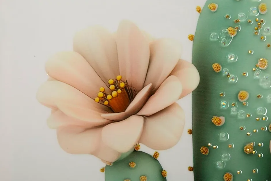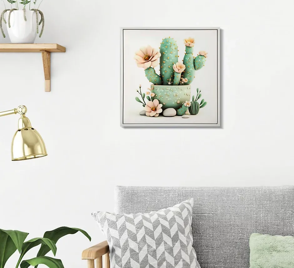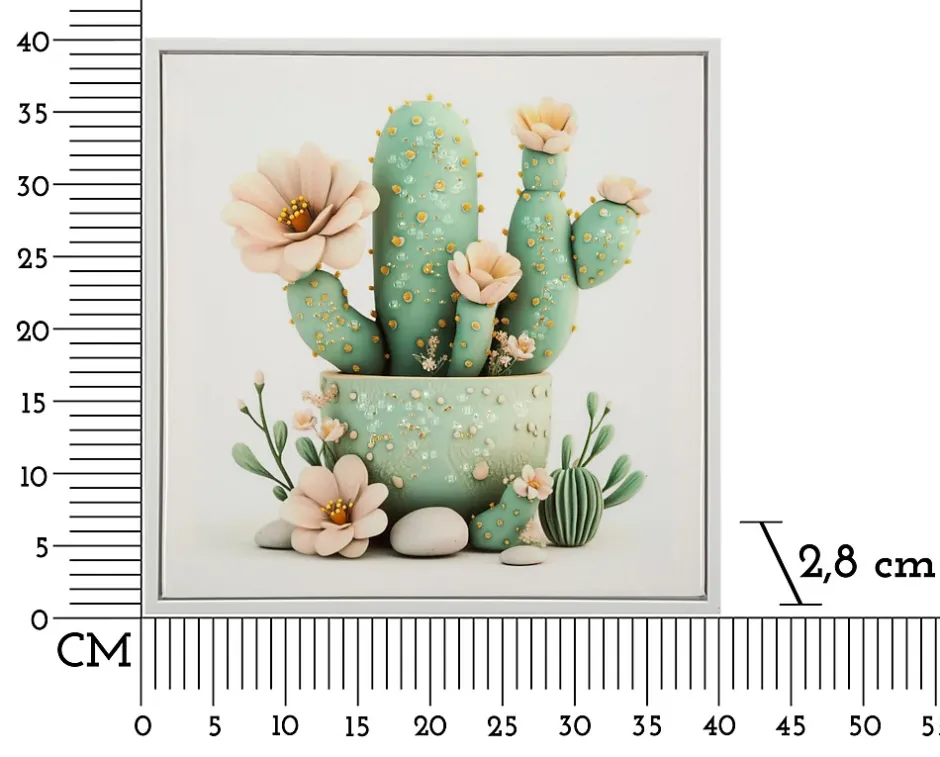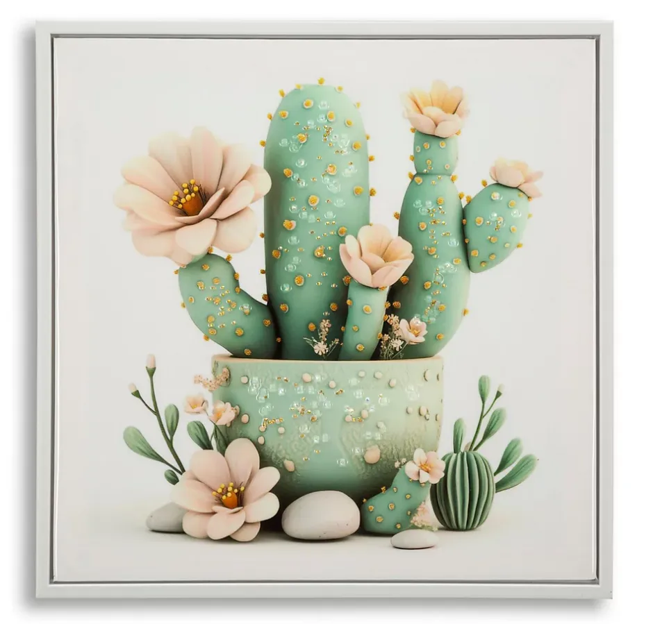 Impression sur toile encadrée de blanc représentant un cactus en fleurs. Avec applications en relief. Dimensions : 40 x 40 x 2,8 cm.