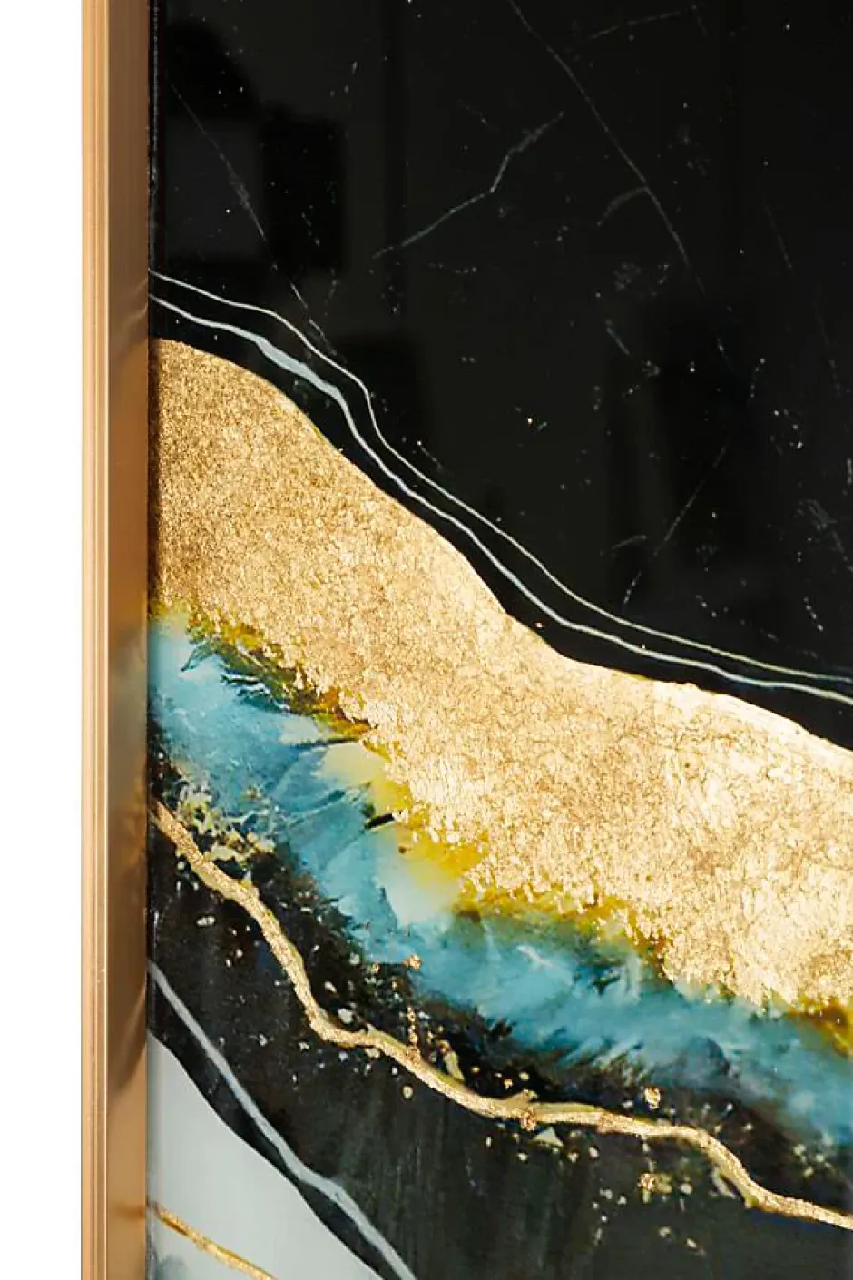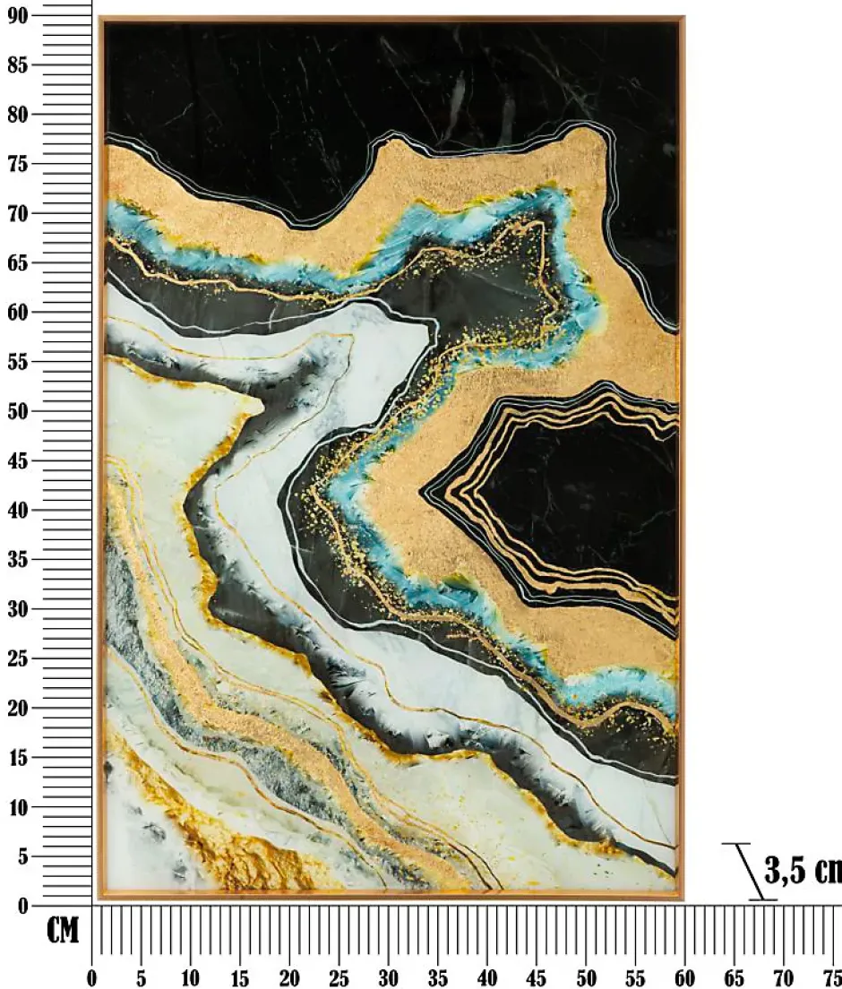 Panneau de verre abstrait avec cadre en aluminium doré. Dimensions : 60 x 90 cm, épaisseur : 3,5 cm.