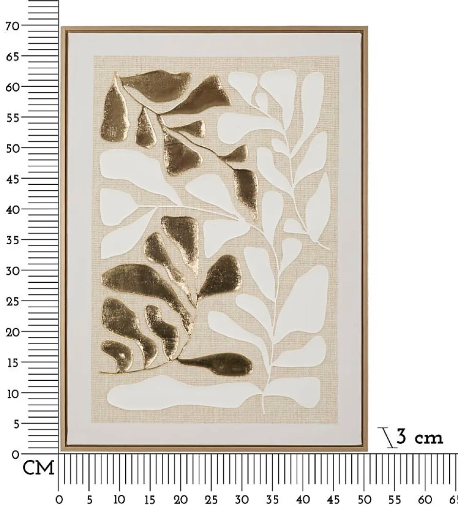 Impression sur toile encadrée de doré représentant un motif botanique stylisé et naturel, apportant légèreté et fraîcheur. Idéale pour ceux qui recherchent une décoration simple et efficace. Avec des applications en relief. Dimensions : 50 x 70 x 3 cm.