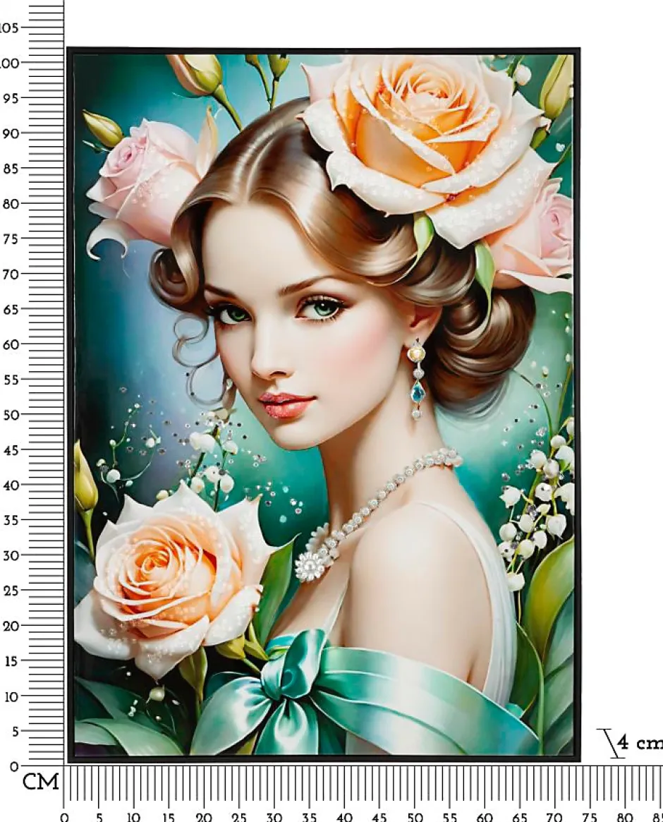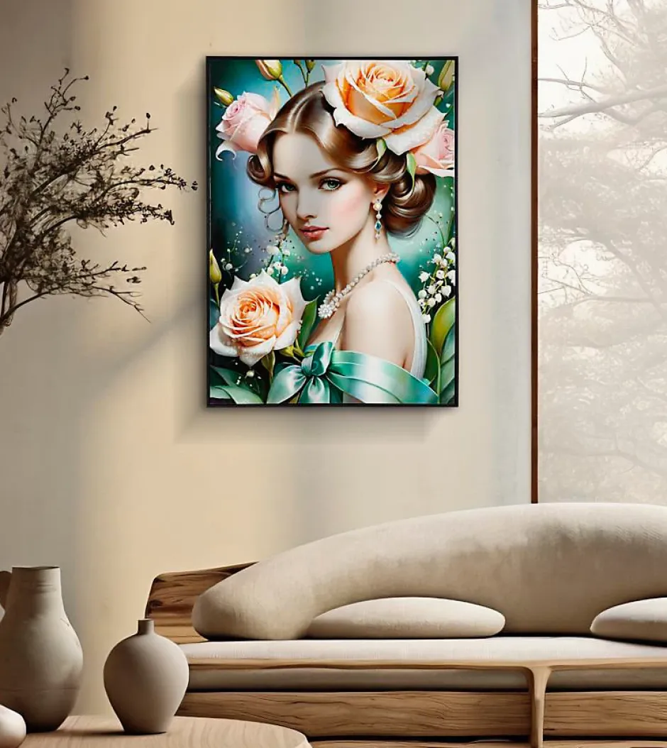 Peinture sur toile, encadrée d’un cadre en bois et d’un cadre en métal noir, elle incarne l’élégance et le charme onirique. Ce portrait féminin, orné de perles et de roses délicates, dégage une aura romantique et sophistiquée. Parfait pour les espaces raffinés, il apporte une touche de magie et de beauté intemporelle. Avec des applications en relief. Dimensions : 72 x 4 x 102 cm.