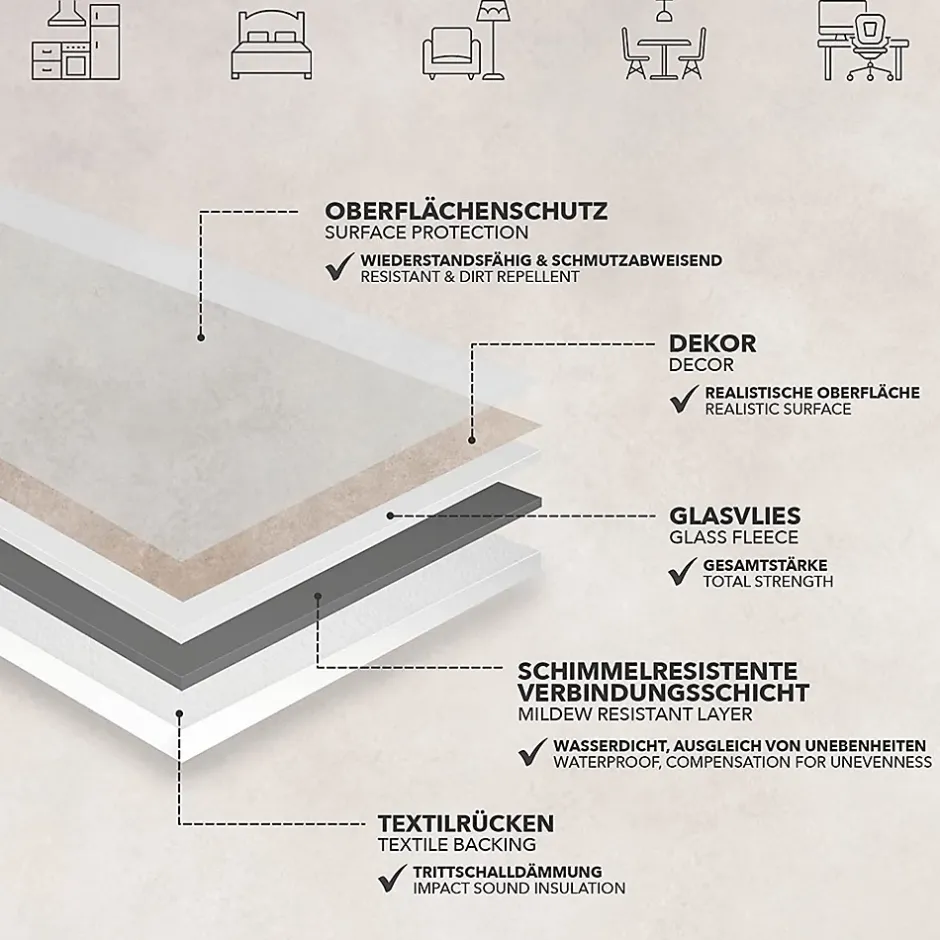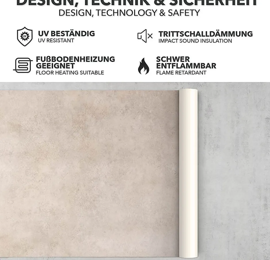 Le revêtement de sol PVC de vous permet de donner du peps à vos quatre murs en toute simplicité et sans grand effort. L’élégant aspect bois gaufré du revêtement confère au sol de votre maison une note individuelle et noble, tout en restant extrêmement facile d’entretien. Sur le plan qualitatif, le sol en vinyle convainc surtout par sa grande résistance à l’usure. Le revêtement de sol en PVC réduit en outre le bruit de roulement et isole du froid. En même temps, il est adapté au chauffage par le sol. Grâce à sa surface fermée, il est très facile d’éliminer les salissures, car un nettoyage humide ou mouillé n’endommage pas le revêtement de sol. Ces propriétés le rendent également idéal pour la cuisine ou la salle de bain. Le produit au mètre peut être facilement découpé sur place, il est lisse dans la pièce grâce à son envers en mousse, sans devoir être collé.