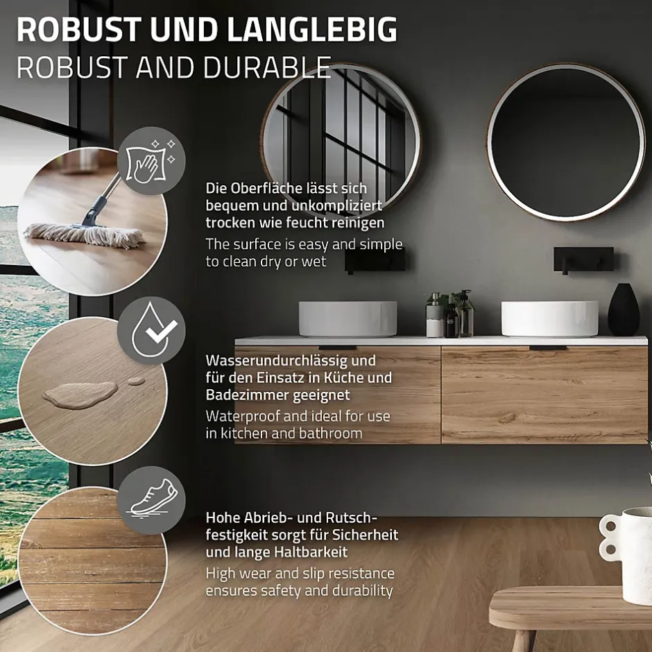 Description du produit:Découvrez le luxe à chaque étape avec notre revêtement de sol PVC vinyle de luxe avec système d’encliquetage en chêne.Vous voulez donner à votre maison une nouvelle apparence exquise ? Notre tout nouveau plancher de luxe en PVC vinyle clipsable à motif chêne est le choix parfait pour combiner élégance et fonctionnalité. Un paquet correspond à 1,54 m² = 7 pièces de stratifié.Détails techniques:Design de haute qualité : le motif réaliste en chêne ajoute une touche de nature et de chaleur à votre pièce.Épaisseur de 4,2 mm : ce revêtement de sol se distingue par sa construction solide, qui garantit sa longévité et sa résistance.Facile à entretenir et résistant à l’usure : notre sol en vinyle est un poids plume lorsqu’il s’agit de l’entretien. Il résiste à la saleté et à l’abrasion, ce qui lui permet de conserver son bel aspect sans trop d’efforts.Résistant à l’eau : il ne gonfle pas et n’est pas endommagé par l’eau. Quel que soit l’endroit où vous le posez, il résiste à l’eau et à l’humidité.Caractéristiques:Système de clicClasse d’émission E1 – la plus faible émission de substances nocivesAutorisation de revêtement de sol 34 – pour un trafic très intenseAntidérapant selon le niveau DSÉpaisseur de 4,2 mmLongue durée de vie et faible abrasionRésistant à l’eau – ne gonfle pasCompatible avec les pièces humidesFacile à entretenir et résistant à l’usureRésistance au feu de classe Bfl-s1 – difficilement inflammablePose facile et rapideSol vinyle moderne pour presque toutes les piècesConvient aux pièces à forte fréquentationLivraison:4 x Cartons de revêtement de sol vinyle ( 28 pièces = 6,16 m² )Information technique:Matériau : PVCCouleur : marronMotif : chêne Golden HourPoids : 12,6 kg par cartonContenu : 28 piècesSurface du pont : 180 x 1220 mmSurface totale : 6,16 m²Épaisseur : 4,2 mmSystème de pose : système à clicLongueur : 122 cmLargeur : 18 cm