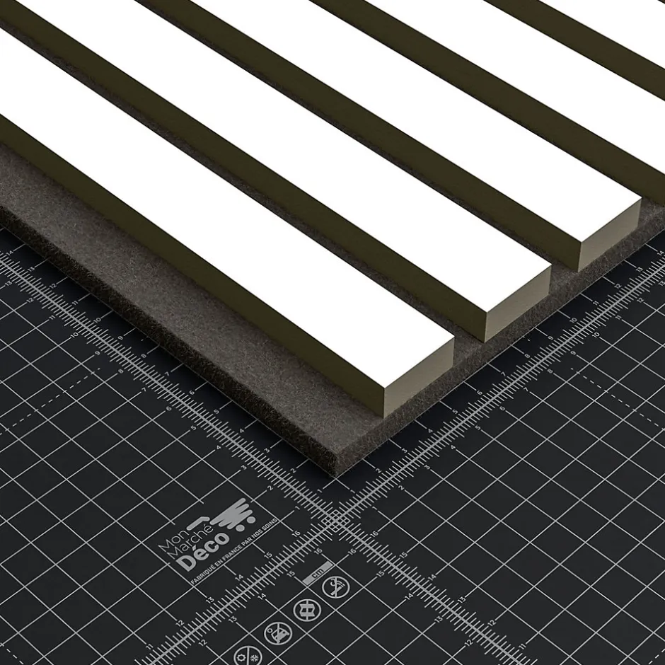 Panneaux tasseaux bois : une déco réussie à coup sûr Vous cherchez une astuce déco à la fois tendance et performante ? Les panneaux tasseaux bois blancs sur feutre noir sont idéals pour pimper votre intérieur et lui offrir un meilleur confort acoustique. Parfaite combinaison de design et fonctionnalité, ces panneaux tasseaux bois permettent de créer une ambiance moderne, chaleureuse et agréable à vivre. À installer sur les murs ou les plafonds, ces panneaux tasseaux bois conviennent à toutes les pièces : salon, salle à manger, bureau, chambre. Faciles à poser, ils permettent d’insuffler un nouveau souffle à votre décoration en temps trois mouvements. Les panneaux tasseaux bois sont esthétiques mais pas seulement. Le feutre sur lequel sont fixés les tasseaux en MDF permettent d’insonoriser et de diminuer la réverbération dans les pièces. Cela améliore l’isolation phonique, rend les conversations plus audibles et réduit le stress. Améliorez votre confort acoustique avec les panneaux tasseaux bois Si la feutrine à l’arrière des panneaux tasseaux bois joue un rôle sur l’esthétique globale, elle agit surtout sur le confort et les performances acoustiques. En effet, elle absorbe les ondes sonores, diminue la réverbération et contribue à créer une ambiance propice à la relaxation et à la détente. Les panneaux tasseaux bois sont idéals pour les lieux bruyants ou nécessitant un environnement calme et apaisé. Ainsi, ils peuvent être installés dans un bureau, une salle de réunion, un restaurant ou bien dans toute autre pièce où l’isolation acoustique est importante.