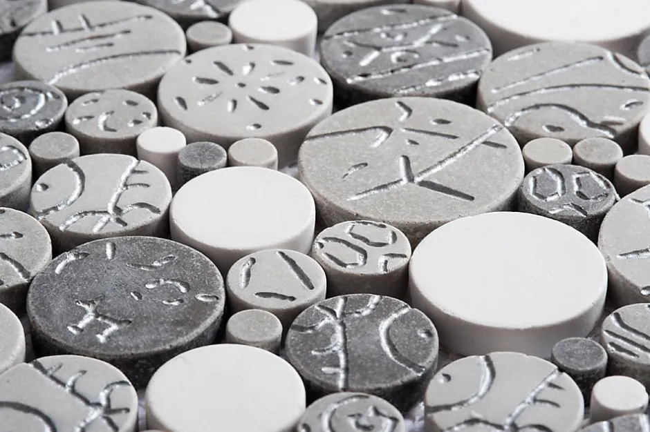 Transformez votre espace avec notre mosaïque de pierre recosntituée ronde taupe blache et argent. Idéale pour cuisine ou une salle de bain esthétique et apaisante.