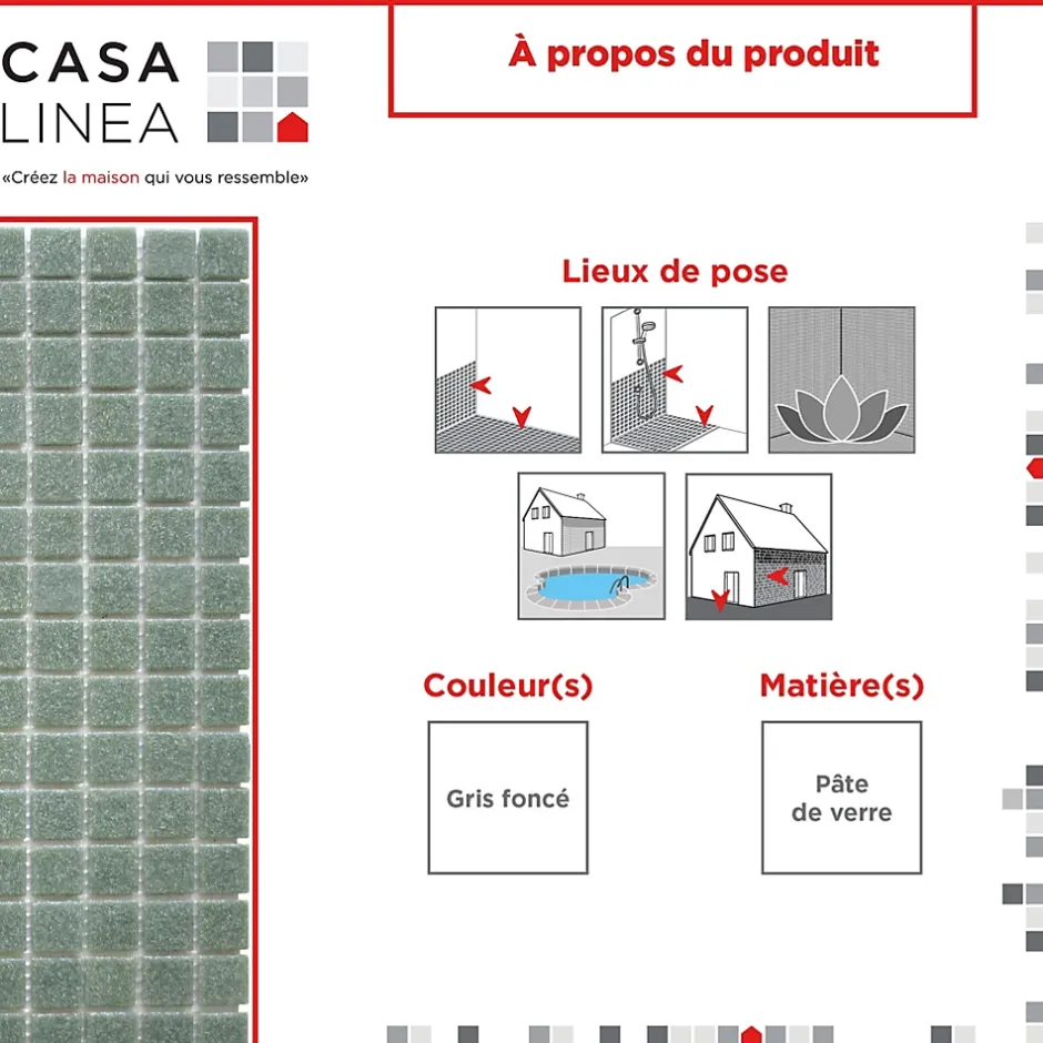 - Conçue pour les piscines, spas et salles de bain, cette mosaïque en pâte de verre est idéale pour les environnements humides.