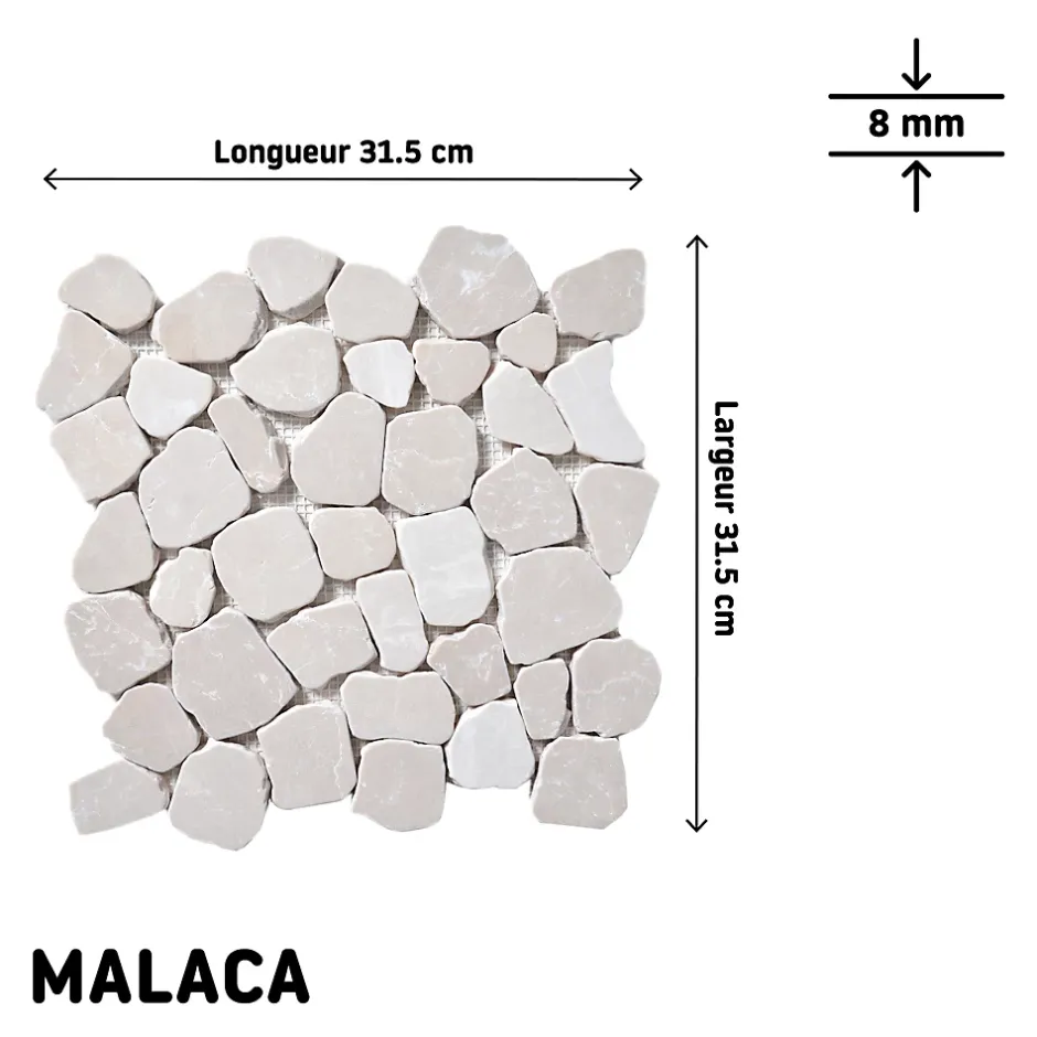 Les mosaïque Malaca en pierre naturelle (315 mm x 315 mm) offrent des nuances et textures variées pour des murs intérieurs personnalisés. Ces carreaux texturés apportent un fini haut de gamme, parfait pour habiller un mur unique ou en complément d’autres carreaux. Compatibles avec le chauffage au sol et conçues pour un usage multi-pièces intérieur, leur finition mate pierre naturelle apporte charme et authenticité. Ces mosaïques durables et élégantes transforment vos cuisines, salons ou couloirs en espaces sophistiqués, esthétiques et fonctionnels, avec un rendu harmonieux et moderne.