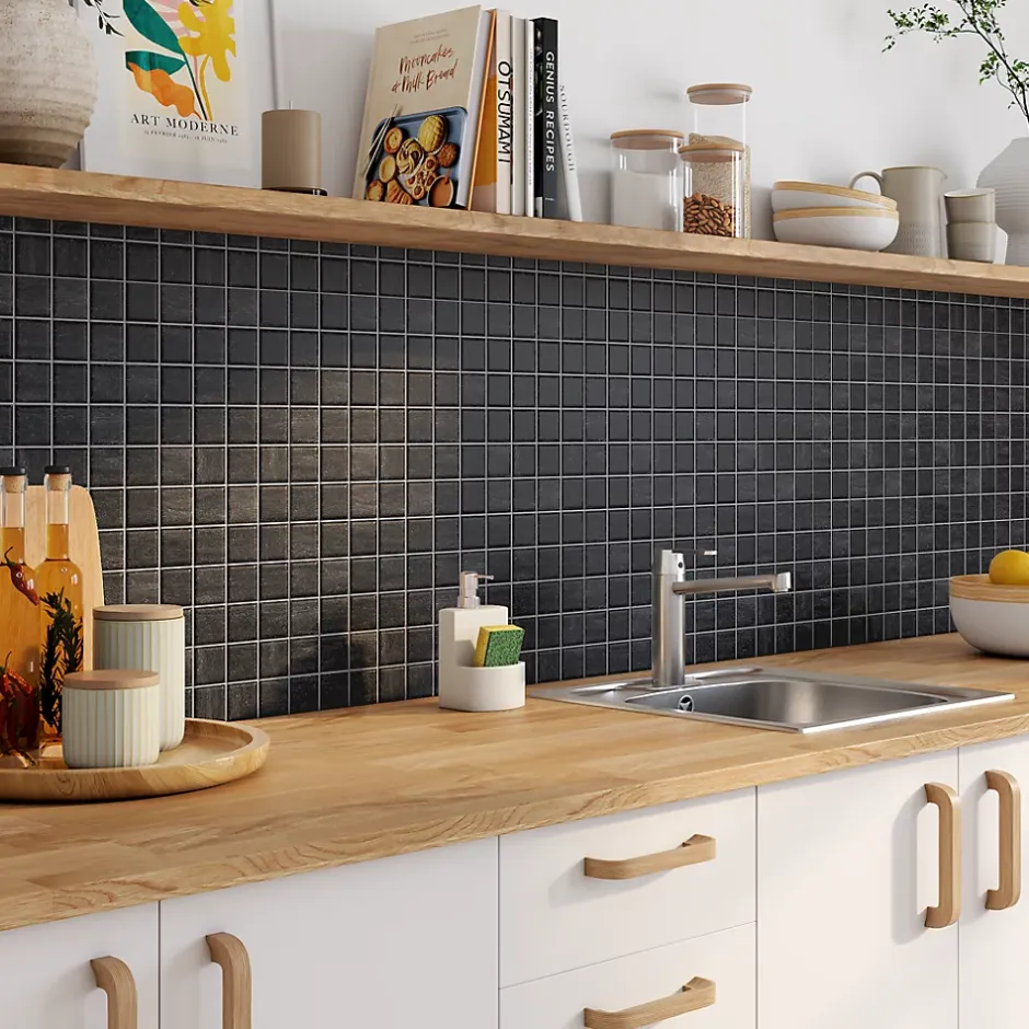 Cette mosaïque noire aspect pierre vous permettra de créer des frises ou des décors dans toutes les pièces de votre maison, voir même sur votre terrasse ou dans votre garage ! Pensez à l’associer au carrelage noir 30 x 60 cm Oikos de la même série