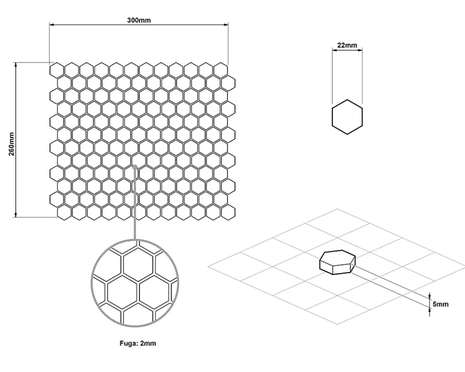 Fabriqué en céramique. Idéal pour une installation murale à l’intérieur de la maison, mais également excellent pour créer des bandes et/ou des inserts décoratifs car il est facile à couper – Il s’adapte à toutes les surfaces droites et ondulées, également idéal pour les sols. La finition de surface permet un nettoyage facile – L’épaisseur est de 5 mm. Taille de la plaque : 26,0 cm x 30,0 cm ; Nombre de plaques par 1 m² : 13 ; Certification : ISO 9001 :2015. 1. Résistant aux températures élevées et aux rayures ; 2. Idéal comme doublure de baignoire ou intérieur de cabine de douche ; 3. Facile à couper à la taille grâce à la maille.