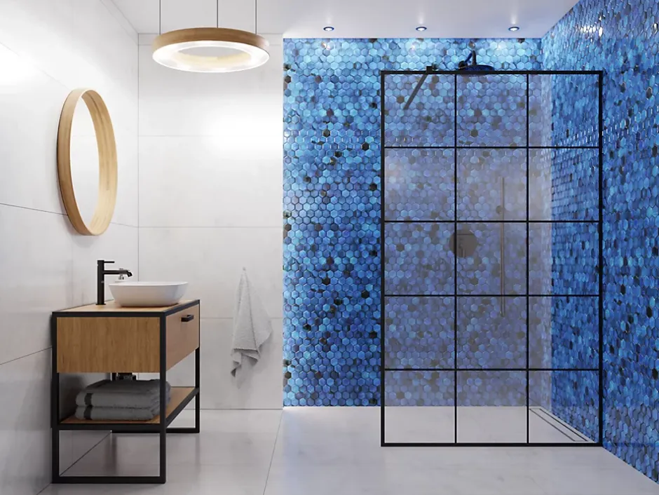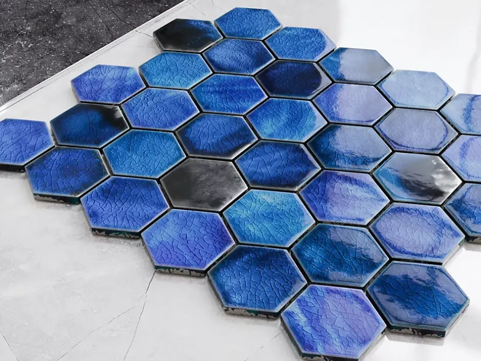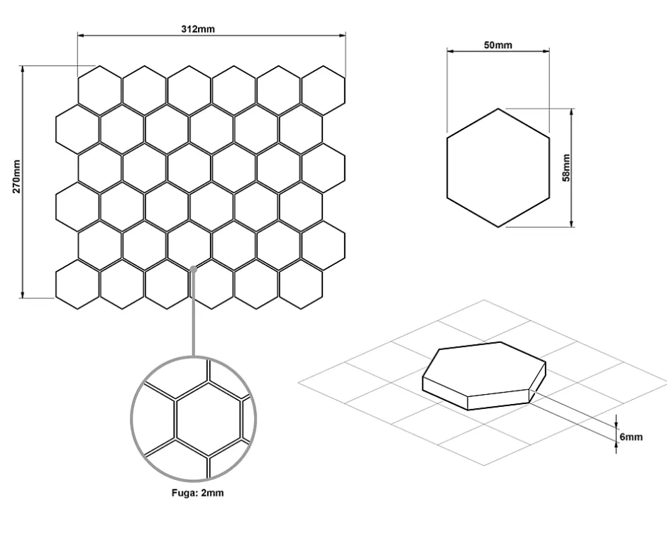 En céramique. Idéal pour l’installation murale dans des environnements intérieurs, mais aussi excellent pour créer des bandes et / ou des inserts décoratifs car il est facile à couper. Il s’adapte à toutes les surfaces, droites et ondulées, également idéal pour les sols. La finition de surface permet un nettoyage facile – L’épaisseur de 6 mm est particulièrement adaptée pour être posée en combinaison avec la plupart des carreaux. Taille de la plaque: cm 31,2 cm x 27 cm; Taille hexagonale du carreau: 5 cm x 5,8 cm; Plaques de quantité pour 1 m² : 11 ; Certification: ISO 9001: 2015.1. Résistant aux températures élevées et aux rayures; 2. Idéal comme couverture de baignoire ou intérieur de cabine de douche; 3. Facile à couper à la taille grâce au treillis écoplastique.La coloration de la mosaïque est basée sur des colorants à réaction, grâce auxquels les couleurs obtenues sont vives, saturées et uniques.Remarque importante : chaque morceau de mosaïque est unique : les cubes varient de couleur du vert à l’argent, avec des éclats de noir.Des décolorations inhabituelles sont un effet désiré.N’oubliez pas de compléter la mosaïque avec un mortier approprié : un mortier contrastant mettra en valeur l’effet de la disposition, tandis qu’un mortier pastel et doux vous aidera à obtenir une texture qui servira de fond élégant aux autres éléments décoratifs de la pièce.