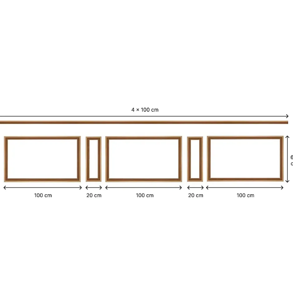 Pack pour habiller un mur de 4m avec des moulures en bois. Moulures prédécoupées et pretes a poser.Le kit se compose de : 3 x Kit moulure 100 x 60 cm 2 x Kit moulure 20 x 60 cm 4 x moulure droite 100 cm