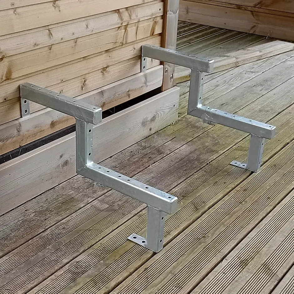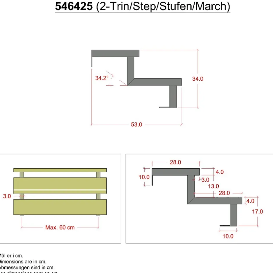 Pack 2 pièces – Limon acier galvanisé 2 marches – H 34cm – Option contremarchesVous souhaitez créer vos propres escaliers de terrasse avec des limons d’escaliers en acier galvanisé à chaud pour votre terrasse ou simplement pour compenser une différence de hauteur dans votre espace extérieur ?Apportez une touche esthétique moderne et industrielle à votre jardin. Alors vous pouvez utiliser nos nouveaux limons d’escalier très pratiques ! Les limons en acier sont disponibles dans les tailles de 2, 3, 4, 5, 6, 7 et 8 marches et le nombre nécessaire dépend de la largeur de vos escaliers. Placez les limons d’escalier à une distance maximale de 60 cm et fixez les planches en bois dessus. Pour les marches en bois, nous recommandons nos marches en bois autoclave classe 4.Épaisseur des limons : 3 cmProfondeur des marches : 28 cmHauteur des marches : 17 cmEn acier galvanisé à chaud2 marches : hauteur 34 cm, emprise au sol 53 cm3 marches : hauteur 51 cm, emprise au sol 78 cm4 marches : hauteur 68 cm, emprise au sol 103 cm5 marches : hauteur 85 cm, emprise au sol 128 cm6 marches : hauteur 102 cm, emprise au sol 153 cm7 marches : hauteur 119 cm, emprise au sol 178 cm8 marches : hauteur 136 cm, emprise au sol 203 cmLivré sans vis en acier ni planches en bois pour les marches.Les limons en acier galvanisé ne peuvent pas être fabriqués sur mesure.Nous recommandons le nombre suivant de limons d’escalier pour construire vos propres escaliers de terrasse :Largeur des marches en bois 60 à 100 cm : 2 limons en acierLargeur 120 à 160 cm : 3 limons en acierPour chaque largeur supplémentaire de 60 cm, un limon supplémentaire doit être placé.