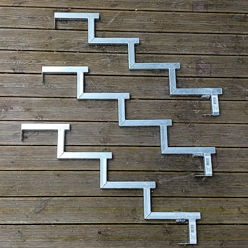 Pack 3 pièces – Limon acier galvanisé 4 marches – H 68cm Vous souhaitez créer vos propres escaliers de terrasse avec des limons d’escaliers en acier galvanisé à chaud pour votre terrasse ou simplement pour compenser une différence de hauteur dans votre espace extérieur ?Apportez une touche esthétique moderne et industrielle à votre jardin. Alors vous pouvez utiliser nos nouveaux limons d’escalier très pratiques ! Les limons en acier sont disponibles dans les tailles de 2, 3, 4, 5, 6, 7 et 8 marches et le nombre nécessaire dépend de la largeur de vos escaliers. Placez les limons d’escalier à une distance maximale de 60 cm et fixez les planches en bois dessus. Pour les marches en bois, nous recommandons nos marches en bois autoclave classe 4.Épaisseur des limons : 3 cmProfondeur des marches : 28 cmHauteur des marches : 17 cmEn acier galvanisé à chaud2 marches : hauteur 34 cm, emprise au sol 53 cm3 marches : hauteur 51 cm, emprise au sol 78 cm4 marches : hauteur 68 cm, emprise au sol 103 cm5 marches : hauteur 85 cm, emprise au sol 128 cm6 marches : hauteur 102 cm, emprise au sol 153 cm7 marches : hauteur 119 cm, emprise au sol 178 cm8 marches : hauteur 136 cm, emprise au sol 203 cmLivré sans vis en acier ni planches en bois pour les marches.Les limons en acier galvanisé ne peuvent pas être fabriqués sur mesure.Nous recommandons le nombre suivant de limons d’escalier pour construire vos propres escaliers de terrasse :Largeur des marches en bois 60 à 100 cm : 2 limons en acierLargeur 120 à 160 cm : 3 limons en acierPour chaque largeur supplémentaire de 60 cm, un limon supplémentaire doit être placé.