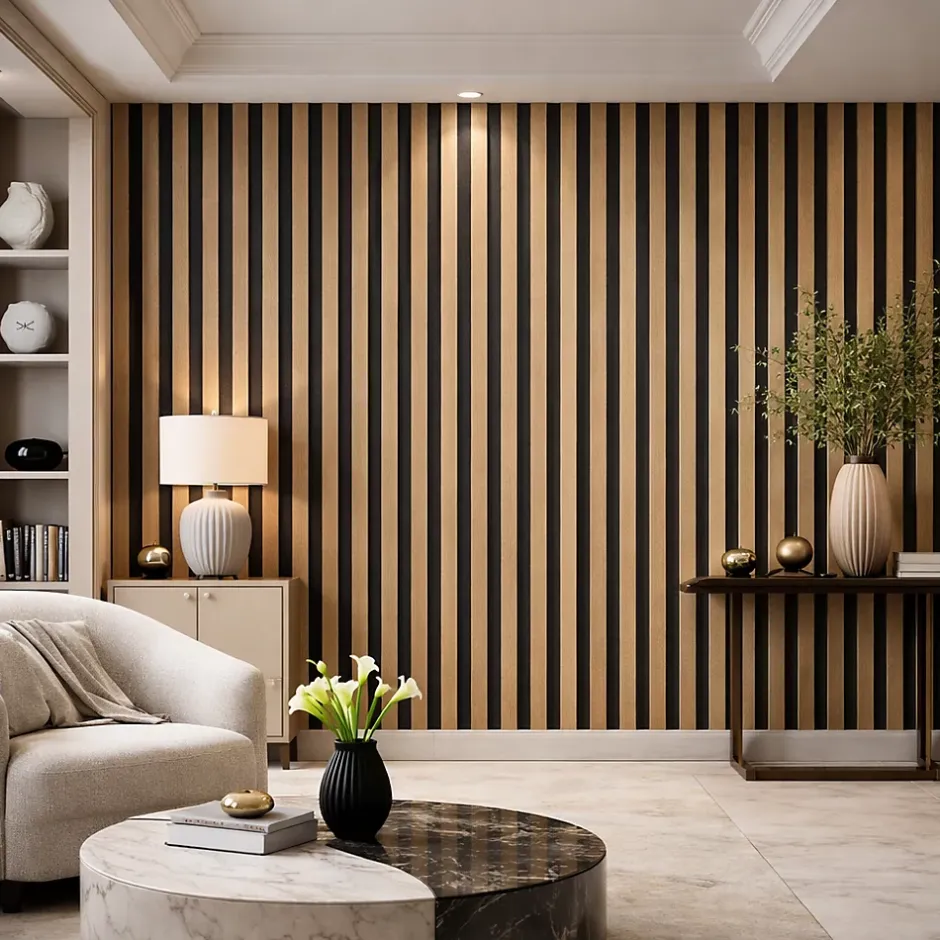 DIVINA HOME – Panneau mural acoustique en MDF et feutre PET, 60×60 cm, design à lattes effet bois, déco acoustique pour la maison et le bureauLe panneau mural acoustique DIVINA HOME allie fonctionnalité et esthétique en une seule solution décorative. Il est conçu pour améliorer le confort acoustique des espaces en réduisant les bruits indésirables, tout en sublimant les murs grâce à un design moderne et raffiné.Sa structure est composée de lattes en MDF effet bois associées à une base en feutre PET absorbant le son. Cette combinaison absorbe jusqu’à 75 % de l’énergie sonore, limitant les échos et les réverbérations et rendant les espaces plus calmes et plus agréables à vivre ou à travailler. L’effet visuel des lattes verticales apporte du caractère à l’espace, tout en conservant un style élégant et contemporain.Ce panneau convient à de nombreux contextes, aussi bien domestiques que professionnels. Il s’intègre facilement dans les salons, les chambres, les bureaux, les studios d’enregistrement, les salles de réunion et les espaces commerciaux, où le confort acoustique est aussi important que l’esthétique.Le format modulaire de 60×60 cm facilite l’installation et offre une grande liberté de composition. Les panneaux peuvent être juxtaposés pour créer des surfaces continues, des cloisons décoratives personnalisées ou des têtes de lit, s’adaptant ainsi à tous les projets.Chaque panneau a une épaisseur totale de 1,3 cm, composée de 0,5 cm de feutre PET et de 0,8 cm de lattes en MDF. Les lattes, d’une largeur de 2,5 cm et espacées de 1,5 cm, sont conçues pour garantir une bonne absorption acoustique et un rendu visuel harmonieux. Les matériaux sont légers, résistants et faciles à travailler.L’installation est rapide et simple, même pour les bricoleurs, grâce à la possibilité de les fixer avec de la colle ou des vis. Les panneaux peuvent également être facilement découpés pour s’adapter à des surfaces ou des besoins spécifiques