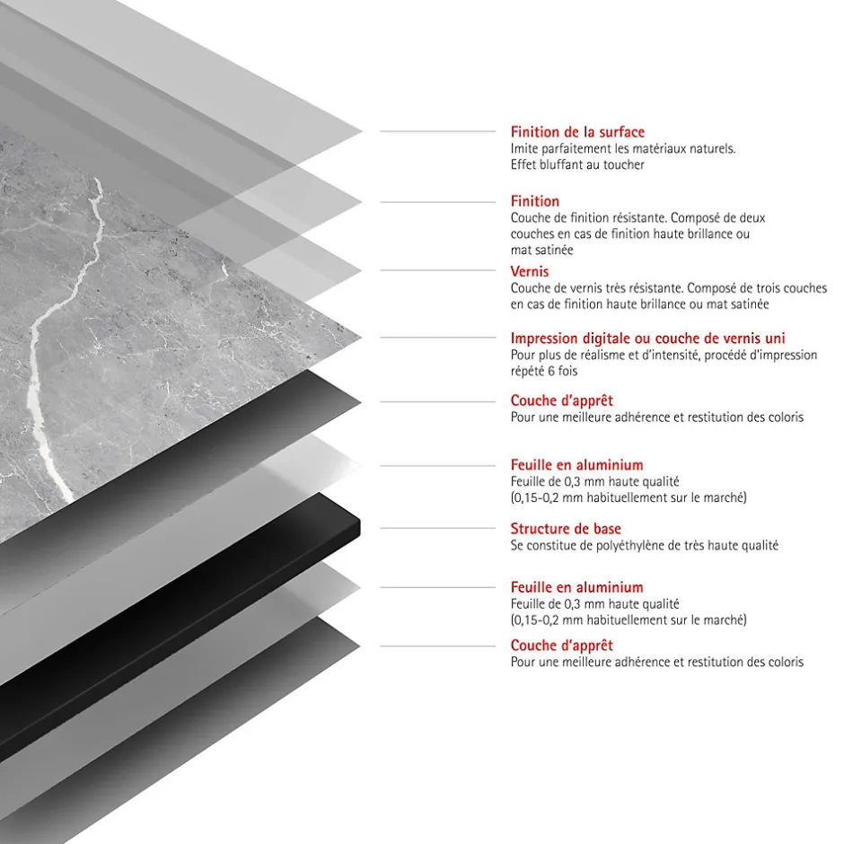 - RÉSISTANT : revêtement en aluminium composite 9 couches. Plaque résistante aux UV, chocs, rayures et à une chaleur allant jusqu’à 100° C. Ne décolore pas. Garantie 10 ans.