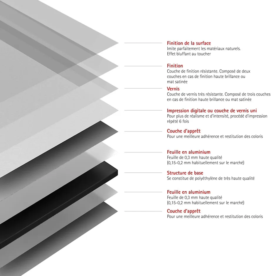 - RÉSISTANT : revêtement en aluminium composite 9 couches. Plaque résistante aux UV, chocs, rayures et à une chaleur allant jusqu’à 100° C. Ne décolore pas. Garantie 10 ans.