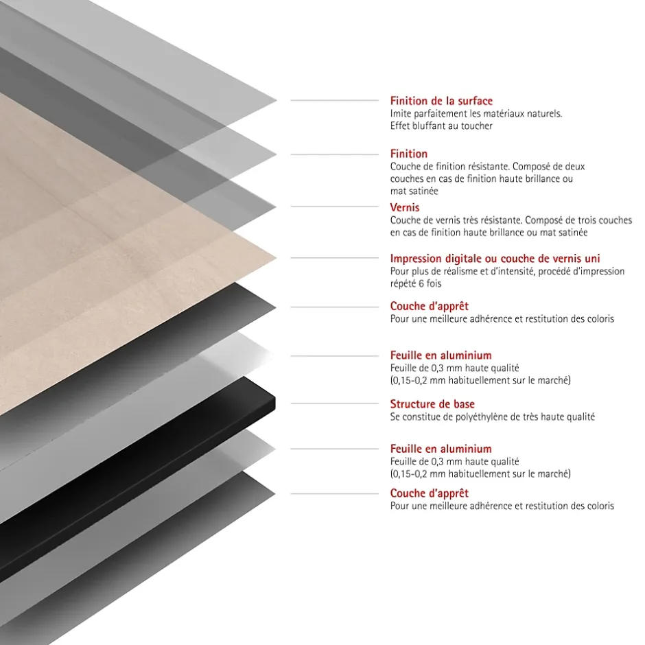 - RÉSISTANT : revêtement en aluminium composite 9 couches. Plaque résistante aux UV, chocs, rayures et à une chaleur allant jusqu’à 100° C. Ne décolore pas. Garantie 10 ans.