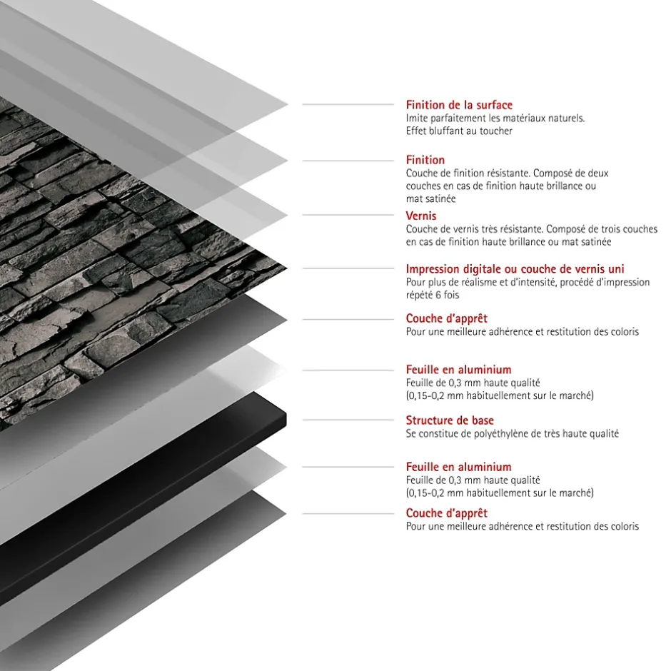 - RÉSISTANT : revêtement en aluminium composite 9 couches. Plaque résistante aux UV, chocs, rayures et à une chaleur allant jusqu’à 100° C. Ne décolore pas. Garantie 10 ans.