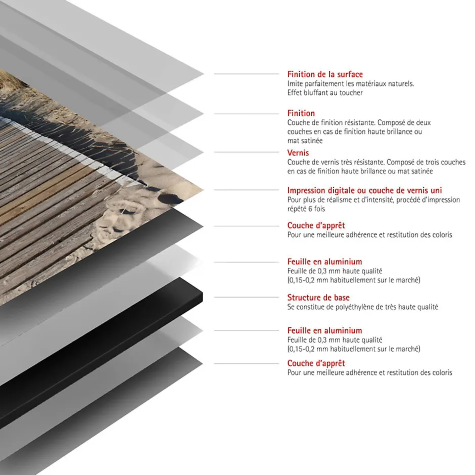 - RÉSISTANT : revêtement en aluminium composite 9 couches. Plaque résistante aux UV, chocs, rayures et à une chaleur allant jusqu’à 100° C. Ne décolore pas. Garantie 10 ans.