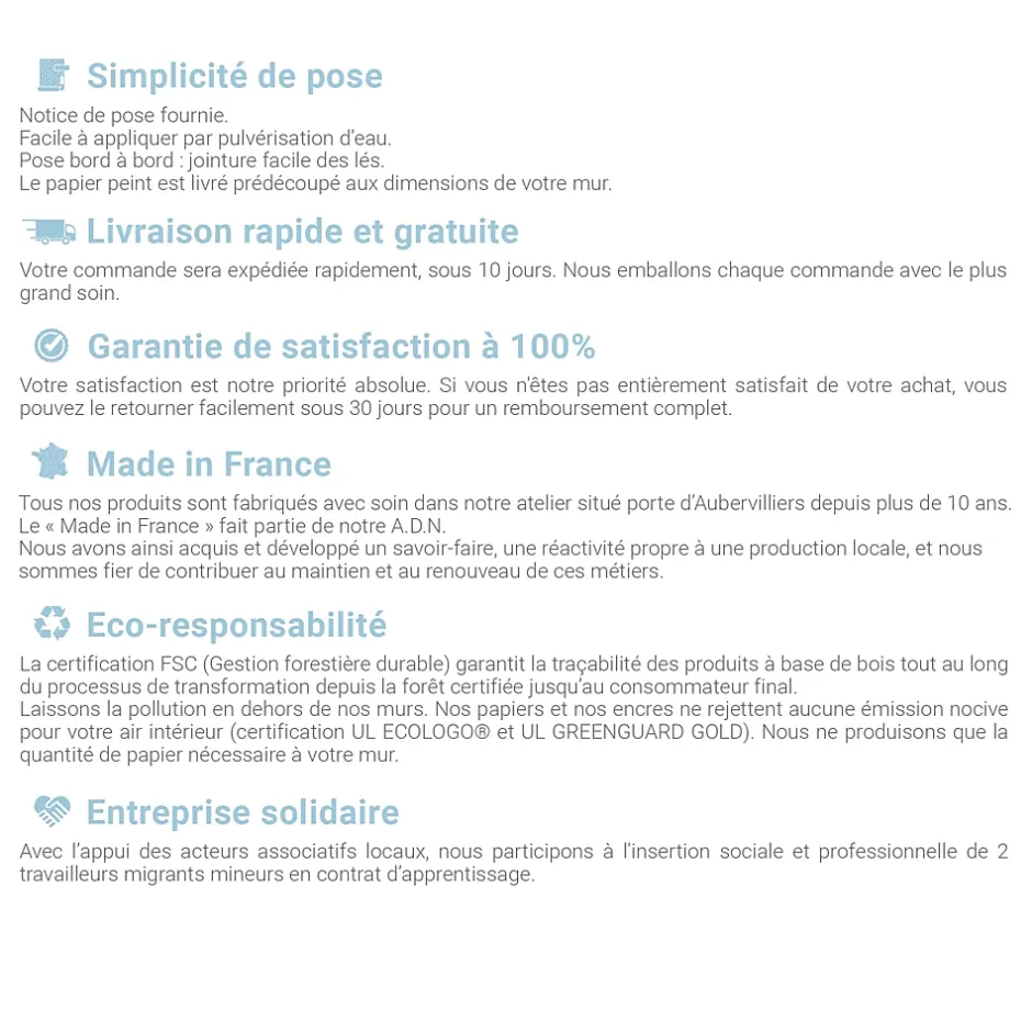 Papier Peint Panoramique Intissé – Qualité Premium & Pose Facile Apportez une touche d’élégance et de modernité à votre intérieur avec notre papier peint panoramique. Conçu en papier peint intissé, il associe fibres de bois et textiles (polypropylène) pour une résistance optimale aux déchirures et à l’humidité. Sa trame épaisse permet de masquer les légers défauts du mur, assurant un rendu parfaitement lisse et harmonieux. Pourquoi choisir notre papier peint panoramique ? Haute qualité & durabilité : plus robuste qu’un papier peint traditionnel, il offre une longévité exceptionnelle avec un entretien minimal. Facilité de pose : grâce à son adhésif activable à l’eau, il se pose sans colle et sans effort. Un simple spray d’eau à l’arrière suffit pour l’appliquer proprement. Impression haute définition : des motifs éclatants et une finition impeccable pour une décoration murale immersive et raffinée. Idéal pour sublimer salon, chambre, bureau, salle à manger ou cuisine, notre papier peint déco transforme votre espace en un véritable lieu de caractère. FABRIQUE EN FRANCE • GARANTIE 10 ANS • durable Simplicité de pose Notice de pose fournie. Facile à appliquer par pulvérisation d’eau. Pose bord à bord : jointure facile des lés. Le papier peint est livré prédécoupé aux dimensions de votre mur. Livraison de votre commande rapide et gratuite Votre commande sera expédiée rapidement, sous 10 jours. Nous emballons chaque commande avec le plus grand soin. Satisfaction garantie à 100% Votre satisfaction est notre priorité absolue. Si vous n’êtes pas entièrement satisfait de votre achat, vous pouvez le retourner facilement sous 30 jours pour un remboursement complet. durable La certification (Gestion forestière durable) garantit la traçabilité des produits