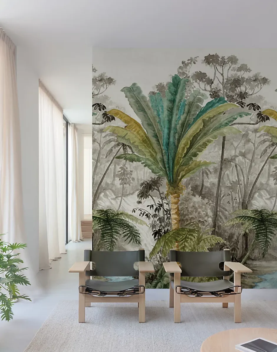 - Notre papier peint mural Palm River représente un paysage de jungle dans une peinture botanique.