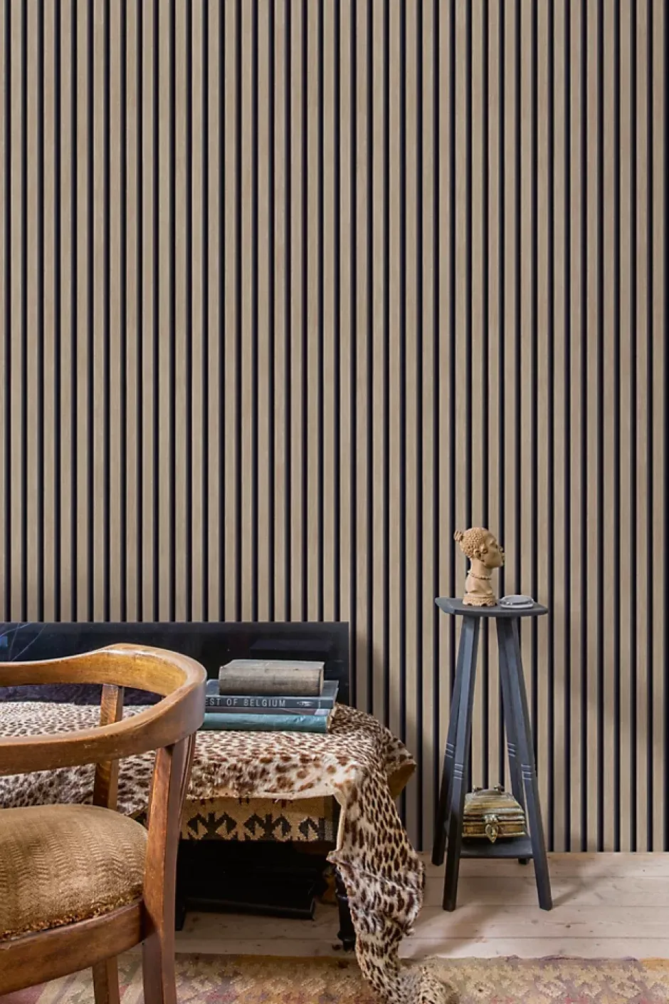 Apportez une touche chaleureuse et naturelle à votre intérieur avec notre papier peint effet lattes de bois. Ce design imite à la perfection l’aspect des tasseaux de bois naturels, offrant une solution idéale pour donner à votre pièce un style cosy et authentique. Les murs en lattes de bois sont très appréciés dans les décors minimalistes et contemporains pour leur capacité à adoucir l’atmosphère tout en créant un rendu organique. Ce papier peint s’intègre facilement dans une chambre en tant que tête de lit, ou dans des pièces telles que le salon, la salle à manger, ou encore une entrée. Ce papier peint imitation lattes de bois offre le charme naturel du bois sans les contraintes d’installation. Conçu en vinyle sur intissé, il est durable, facile à poser et résistant à l’humidité, ce qui le rend idéal pour des espaces comme la cuisine ou la salle de bain. Le vinyle confère une finition étanche et permet un nettoyage rapide avec un chiffon humide, parfait pour les zones à fort passage.