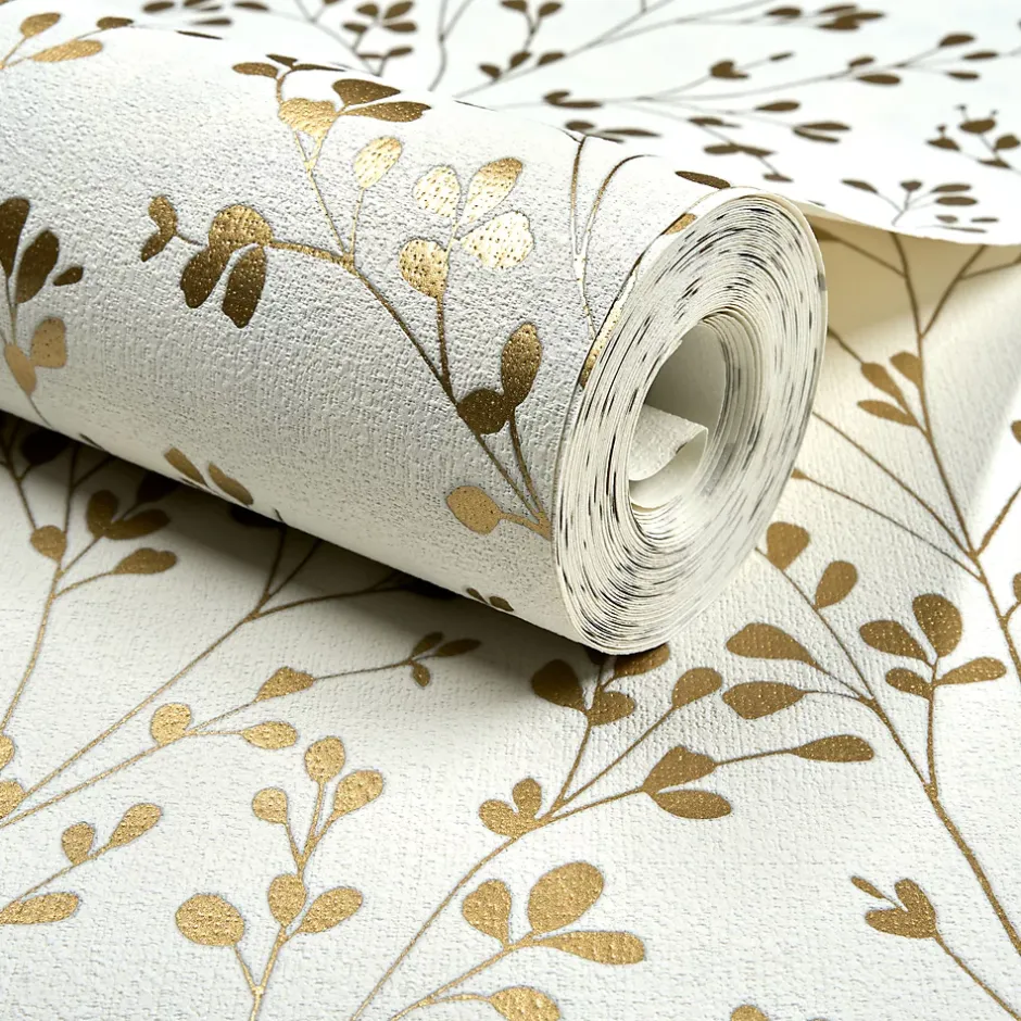 Papier peint vinyle intissé feuillage Omura doré, blanc L.1005 x l.53cm Grandeco
