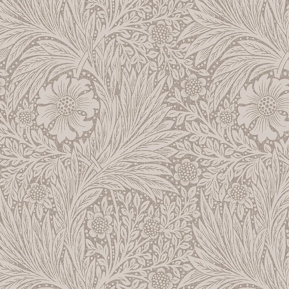 Marigold a été conçu par William Morris et enregistré comme papier peint en 1875. Le motif intègre de grandes fleurs de souci parmi des rameaux de feuilles ressemblant à celles du saule, sur un sous-motif composé de feuillages et de fleurs plus petits. Le motif monochrome a été produit dans une grande variété de coloris. Morris a également déposé le motif en tant que coton imprimé plus tard en 1875, l’un des trois seuls motifs que Morris avait spécifiquement destinés à être produits à la fois comme textile et comme papier peint. Marigold Metallic Champagne présente ce célèbre motif dans une belle couleur crème clair, parfaitement mise en valeur par un fond doré métallique, qui souligne et rehausse ce magnifique motif.