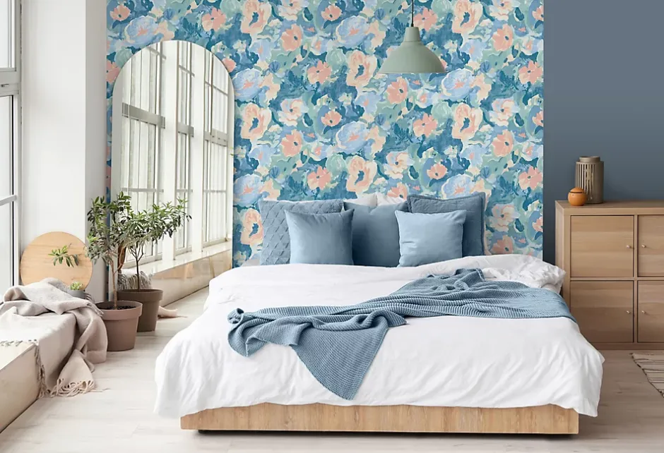 Papier peint vinyle intissé fleuri Floral gouache vert, bleu pastel L.1005 x l.53cm Ugèpa