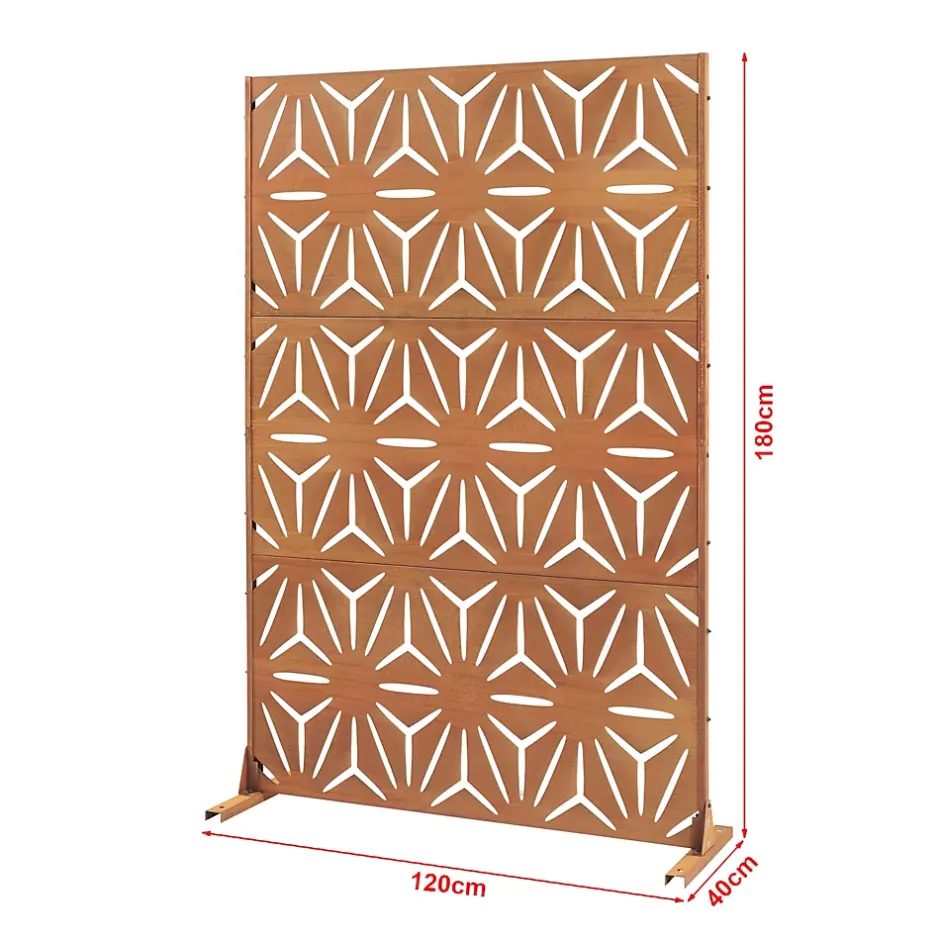 Cette cloison de séparation polyvalente s’adapte aux environnements intérieurs et extérieurs, délimite les espaces tout en protégeant du vent et du soleil, affiche un motif décoratif moderne, s’installe facilement grâce à une structure robuste et est fabriquée en acier pour une utilisation longue durée.