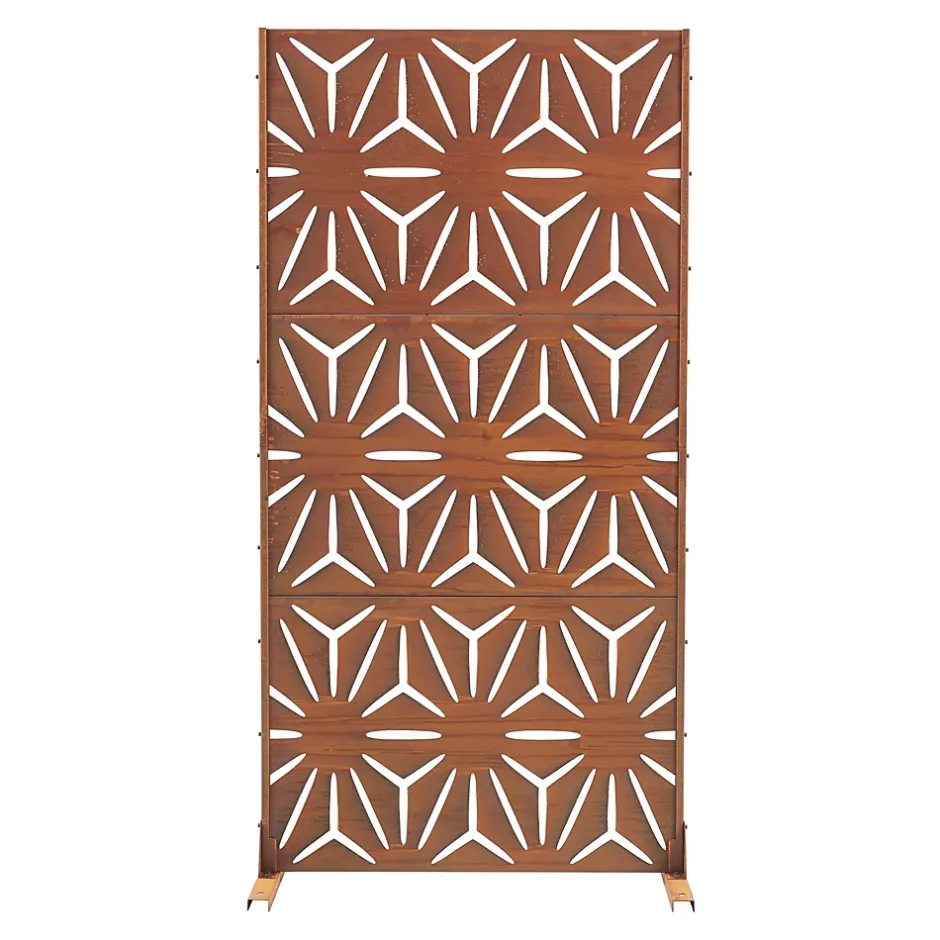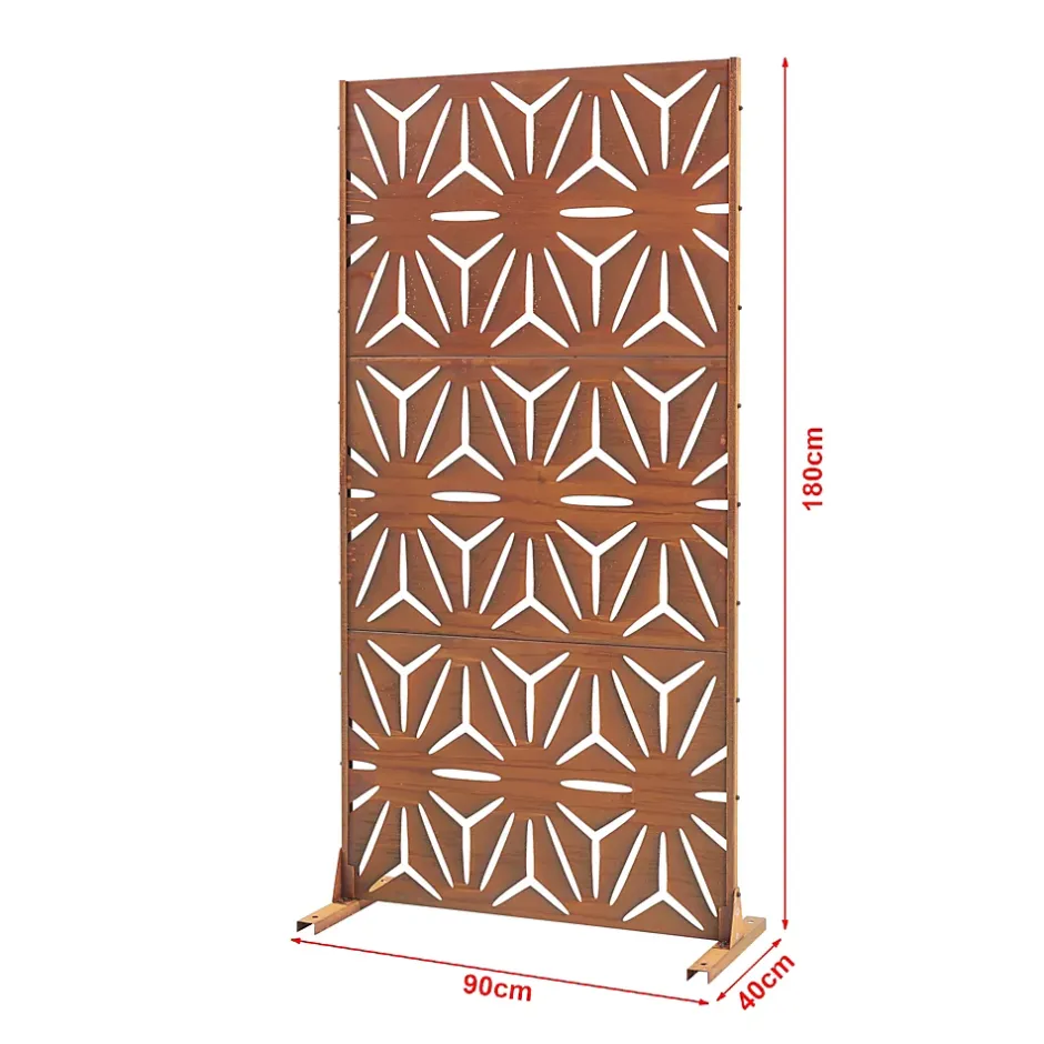 Cette cloison de séparation polyvalente s’adapte aux environnements intérieurs et extérieurs, délimite les espaces tout en protégeant du vent et du soleil, affiche un motif décoratif moderne, s’installe facilement grâce à une structure robuste et est fabriquée en acier pour une utilisation longue durée.