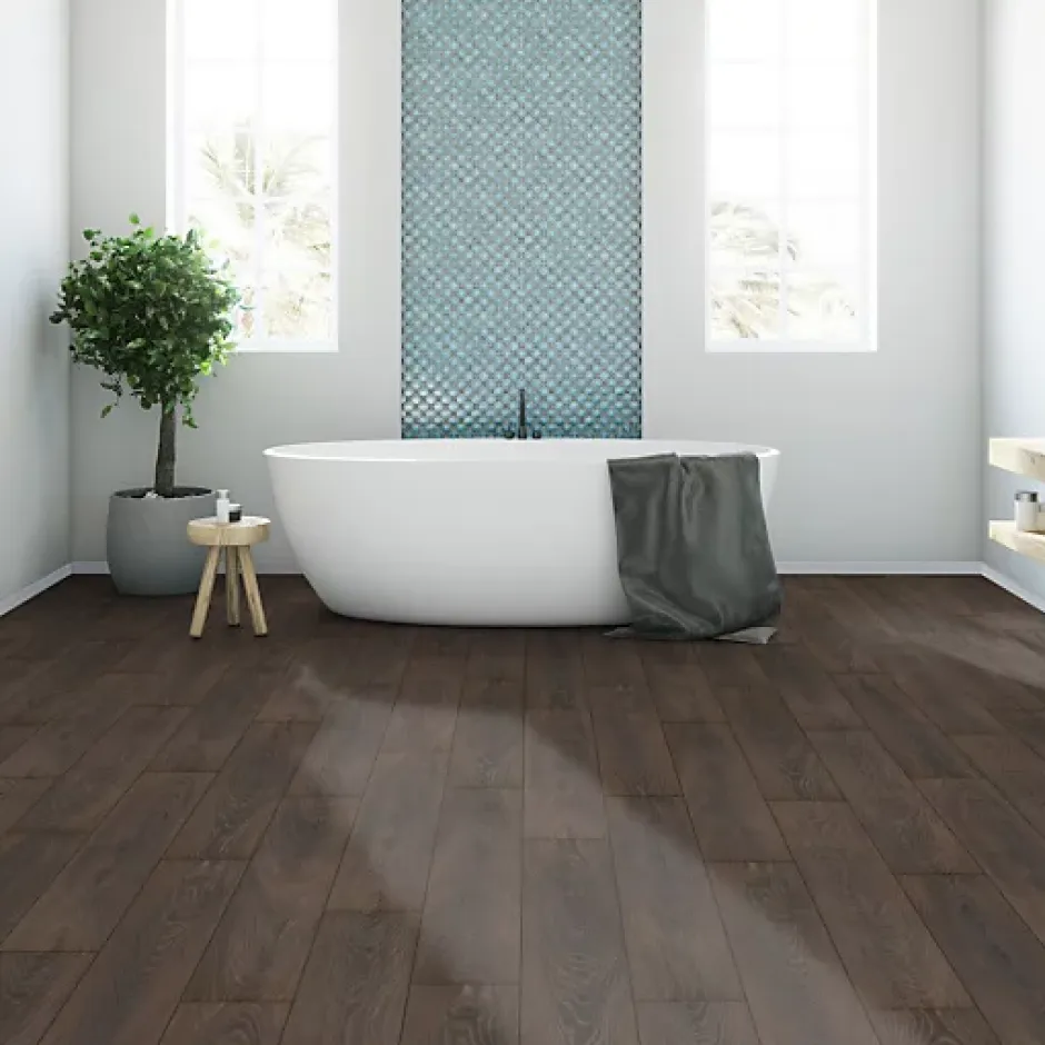 Paquet de 6 lames de parquet flottant stratifié ter Hürne Cuisine et salle de bain – Lames larges – Chêne Cocoa, compatible pièces humides, fabrication allemande, 1,507 m²/paquet. Ce sol stratifié, composé à 90% de bois et matériaux organiques, est hydrofuge, robuste, antibactérien et facile à entretenir, idéal pour cuisines, salles de bains et foyers avec animaux. Le système clipsable «Smart Connect Pro Aqua» assure une résistance à l’eau stagnante de 48 h (éclaboussures, verre renversé, gamelle). Le montage est rapide et fiable, avec un profil limitant la pénétration d’eau (en pose collée). Caractéristiques principales : • Garantie : 30 ans usage domestique, 5 ans usage commercial • Dimensions : 128,8 x 19,5 cm, épaisseur 12 mm • Pose : Flottante, sans colle, système clic SmartConnect Pro Aqua • Compatibilité chauffage au sol : Jusqu’à 26°C (système à eau uniquement) • Classements : Usage domestique 23, commercial 33, COV A+, formaldéhyde E1 • Résistances : Rayures AC5, poinçonnement 0,05 mm, glissements DS • Fabrication : Allemagne • Poids : 16,5 kg/paquet • Construction : Couche de surface en résine précieuse et corindon • Décor en fibres de bois, support en fibre de bois extrêmement comprimé • Dossier en cellulose • Pour planchers chauffants, vérifiez l’humidité (0,3% pour chapes anhydrites, 1,8% pour ciment). Joint de dilatation nécessaire pour grandes pièces. Surface traitée antibactérien. • Couleur : Il peut y avoir de lègères variations selon les productions