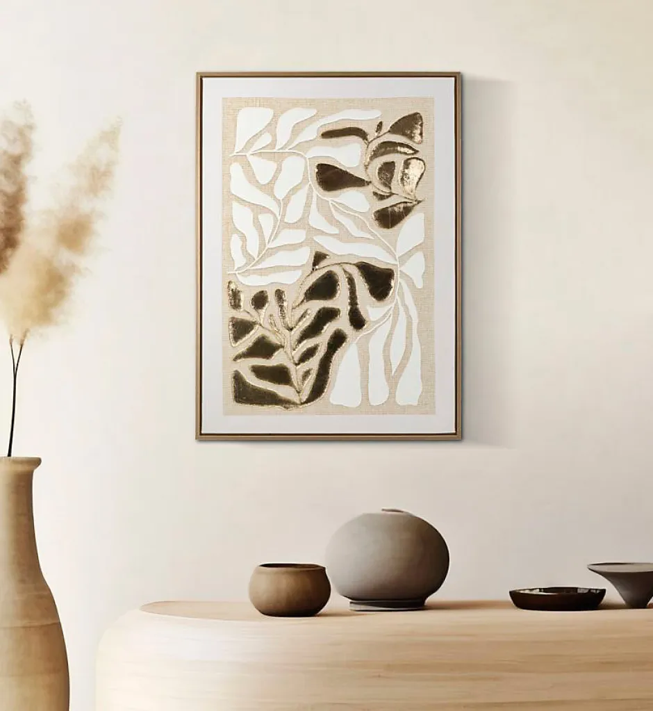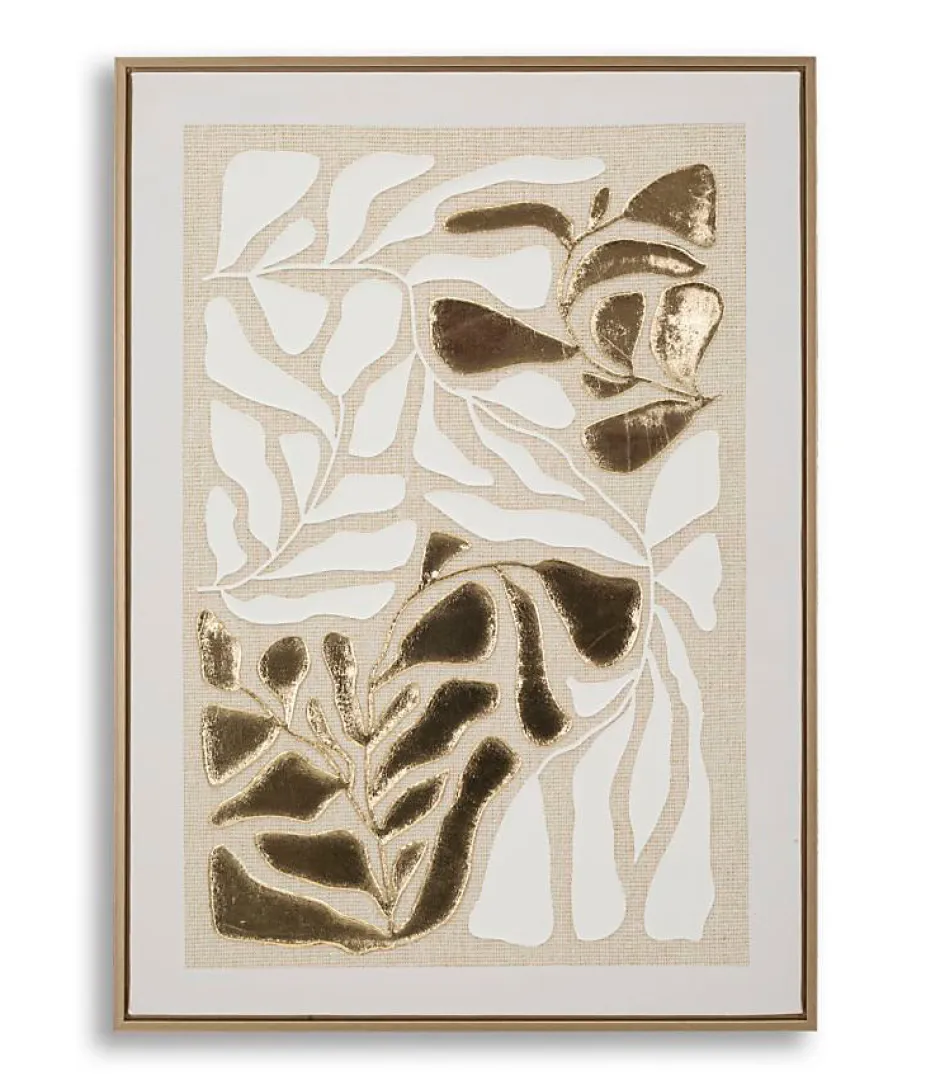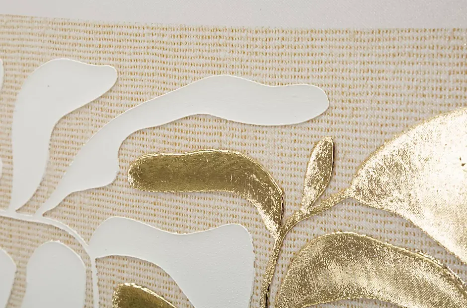 Impression sur toile encadrée de doré représentant un motif botanique stylisé et naturel, apportant légèreté et fraîcheur. Idéale pour ceux qui recherchent une décoration simple et efficace. Avec des applications en relief. Dimensions : 50 x 70 x 3 cm.