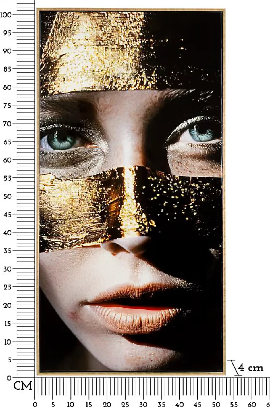 Peinture sur toile avec cadre en bois et cadre en métal doré. Elle représente un visage à l’élégance et à l’intensité, sublimé par des touches métalliques et des détails précieux. Idéale pour les amateurs de mobilier moderne et de décorations originales. Avec applications en relief. Dimensions : 52 x 4 x 102 cm.