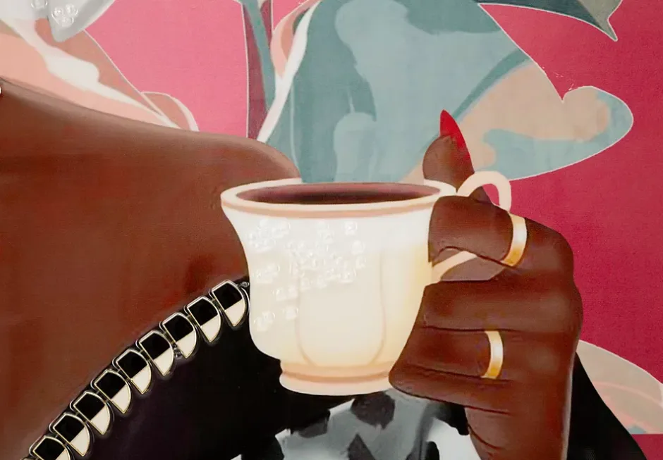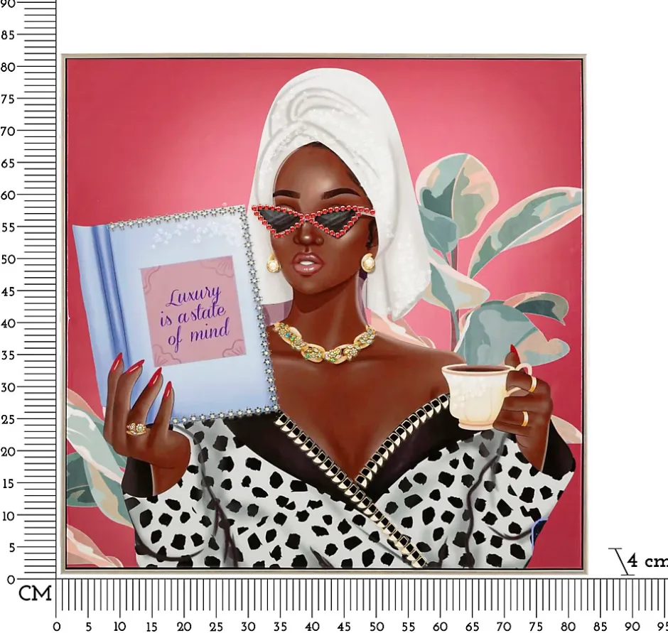 Cette toile, encadrée dans un cadre en bois et en métal doré, incarne l’élégance et la détente avec une touche de glamour. La silhouette féminine, enveloppée dans un peignoir moelleux, portant des lunettes tendance et une tasse de thé à la main, évoque une atmosphère de luxe et de bien-être. Son fond raffiné et ses détails soignés en font un tableau parfait pour les environnements chics et sophistiqués. Avec des applications en relief. Dimensions : 82 x 4 x 82 cm.