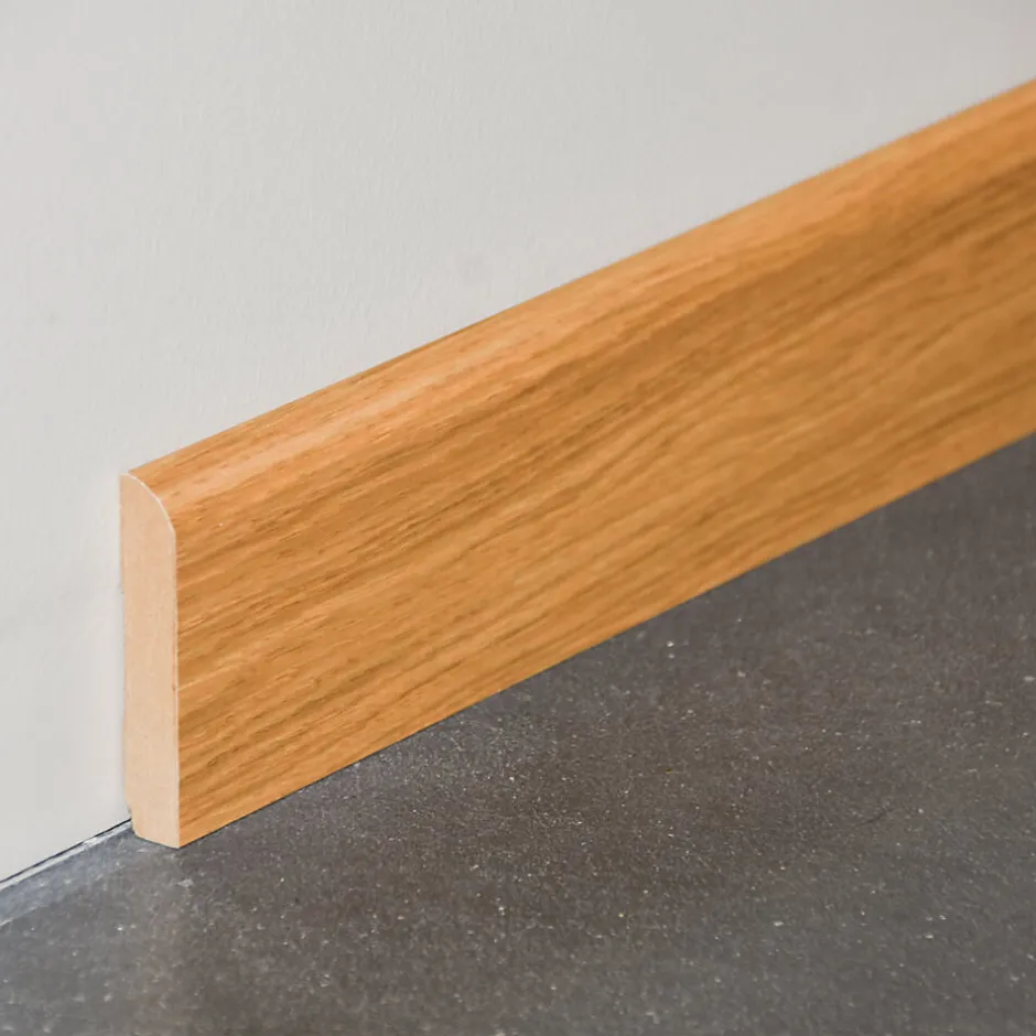 Plinthe MDF chêne français 2 m Notre plinthe MDF chêne français 2 m offrira une finition élégante à vos murs. Sa couleur chatoyante et raffinée créera une atmosphère chaleureuse et conviviale dans la pièce choisie. Mais outre l’aspect esthétique, cette plinthe MDF chêne français 2 m offre une réelle protection contre les divers impacts et salissures survenant en bas des murs. Notre plinthe viendra également parfaire l’installation d’un parquet et dissimuler les joints de dilatation indispensables pour laisser travailler le plancher. Le profil aux bords arrondis de notre plinthe MDF chêne français 2 m, fortement apprécié, en font des plinthes très demandées qui se marieront parfaitement avec votre décoration intérieure. Les nombreux décors proposés vous permettront d’obtenir le contraste ou effet déco recherché. Plinthe MDF Fabrication française Dimensions