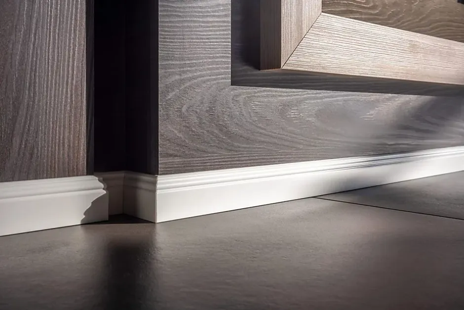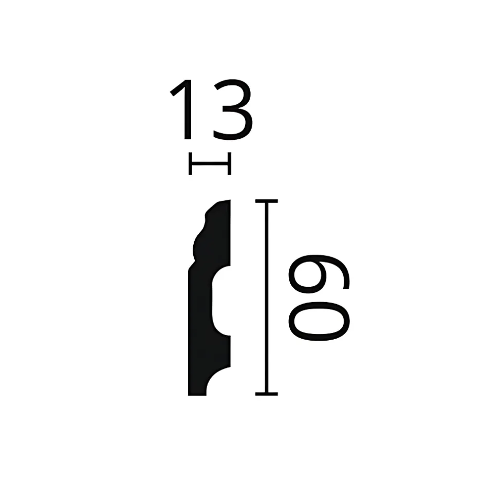 - Plinthe, dimensions: 200 cm x 1,3 cm x 6 cm. La surface est prépeinte en blanc (RAL 9016)