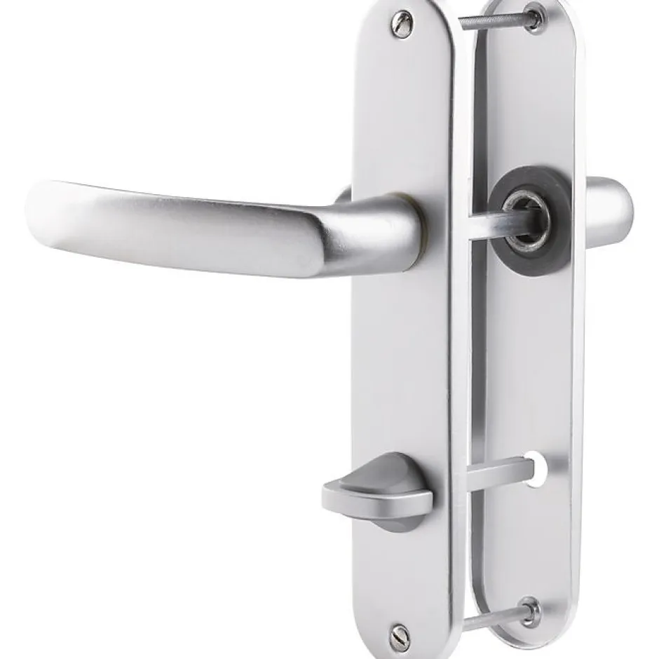 Idéale pour les portes de salle de bain, les portes WC, pour les pièces d’eauPoignée de porte avec bouton de condamnation, poignée de porte sur plaqueEnsemble de poignées : béquille doubleGris argentEntraxe de fixation : 165 mmÉpaisseur de porte : 40 mm