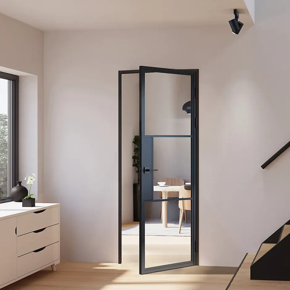 Élément décoratif et moderne à part entière. Un bloc porte intérieur vitré sépare les espaces et crée une ambiance cocooning une fois fermé. Sa transparence laisse passer la lumière et donne une sensation de volume dans la pièce. Que ce soit à la maison ou au bureau, cette porte verrière pivotante à 3 partitions se pose partout, peu importe la taille et le style de votre espace. Couleur : RAL 9005Nos portes à ouverture extérieure sont choisies pour des raisons esthétiques ou tout simplement pratiques, car elles permettent de libérer plus d’espace dans la pièce. AVANTAGES PRODUIT :Facile : réaménager, agencer et décorer sans gros travaux de rénovationSéparation de pièce: limite la propagation des odeurs de cuisine, divise une grande pièce en deuxÉconomie d’énergie: cette porte isolante thermique maintient la température dans les piècesParoi vitrée: laisse passer la lumière et donne une sensation de volumeSphère privée : grâce au système de verrouillageDo it yourself : produit prêt à poser avec notice détaillée DÉTAILS TECHNIQUES :Bloc-porte vitré, kit de ferrure en acier, 1 vantailParoi en verre de sécurité de 4 mm d’épaisseur, répond à la norme DIN 12150, bords du verre polisLargeur totale : 775 mmHauteur totale : 2015 mmPour ouverture : 777 mm x 2017 mmPorte : 709 mm x 1972 mmPoids : 33kgProfondeur : 40 mmPoignées, serrure et charnières en acier inoxydablePorte affleurante avec trous de montageOuverture de la porte à gaucheRésistant aux rayuresLivré avec poignées, serrure, charnières et kit de montageLivré avec huisserieGarantie produit : 10 ans (pièces d’usure exclus)Garantie réapprovisionnement pièce détachées : 10 ans